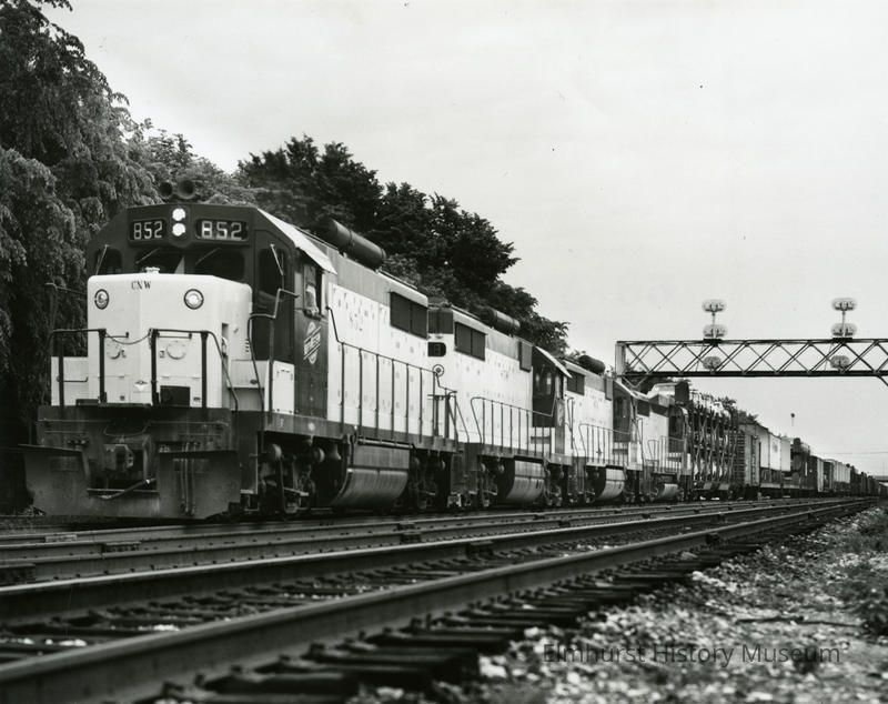 Chicago & North Western freight train showing the front engine "CNW 852". Train is traveling under a signal bridge east of Haven Street in Elmhurst.Photograph Details