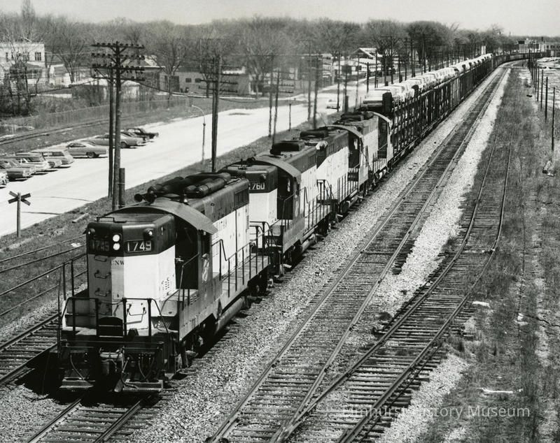 Chicago & North Western freight train, engine CNW 1749. Photographer is looking down onto the train. Looking east from west First Street, near the Elmhurst-Chicago Stone Company.Photograph Details