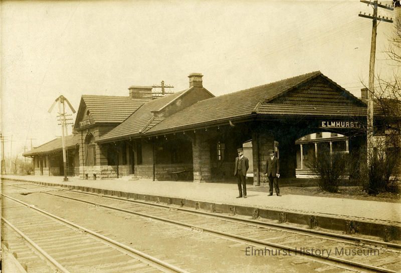 Chicago & North Western Railroad depot on W. First Street. Agent Will S. Weller is on left.