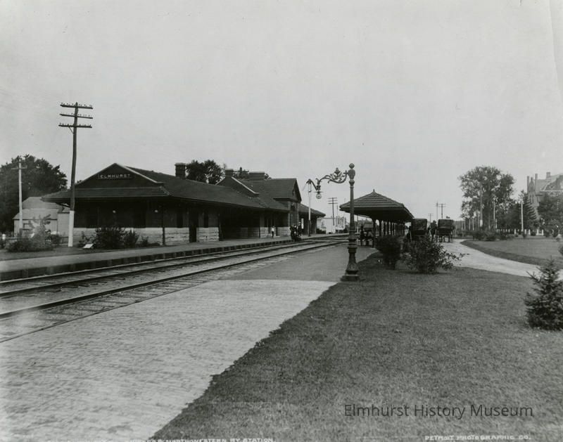 Chicago & North Western Railroad depot showing people on the platform and horse drawn buggies on a road, looking east towards York Street.Photograph Details