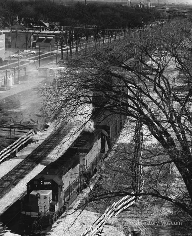 Photo Identification hand-written on the back of the print: "Elmhurst Underpass Program: From on top of Elm. Nat'l Bank Bldg looking E. - CNWRR freight navigates 'shoo fly' due to underpass bridge construction. Note train tracks are on E. Park Av. There is a blue stamp in the lower right corner on the back "Photo by Bob Kross Elmhurst, Illinois." Print is dated Mar 30, 1977.