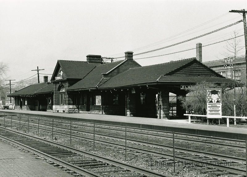 The Chicago and North Western Railroad station on First Street in Elmhurst, looking northwest. This photograph was taken shortly before the demolition of the train station.Photograph Details
