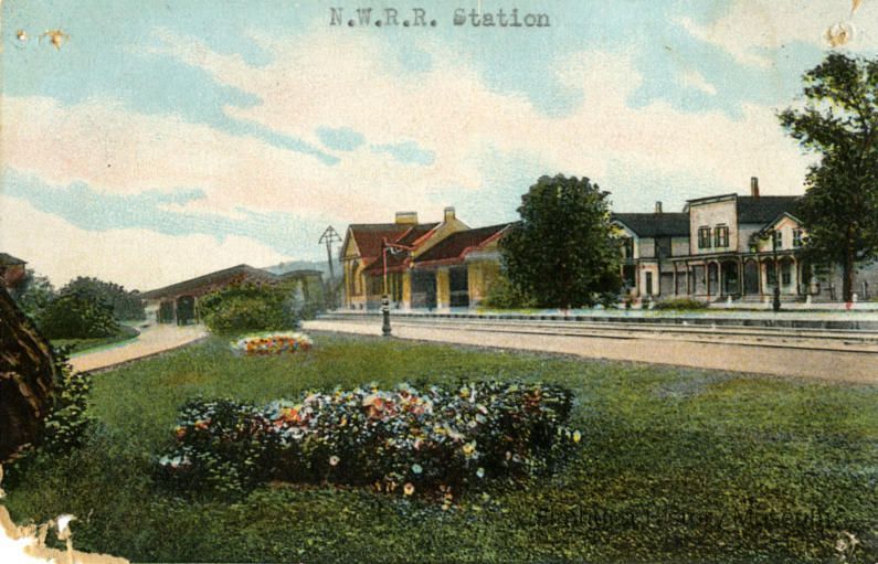 Typed on front: N.W.R.R. station Printed on the back: No. D2690 / LITHO-CHROME Stamped on back: Elmhurst / Historical / Commission Publisher credit: A.M. Denig, Elmhurst, Ill. / Made in Germany