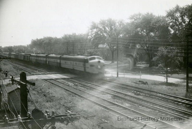 Written on back: E8 & F7's CNW No. 3 at HM tower Sept 1957 Elmhurst
