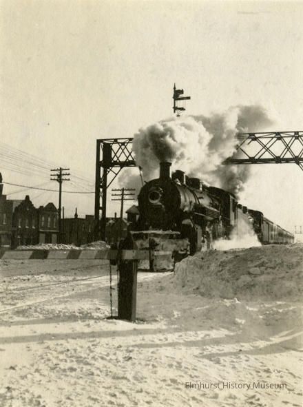 Chicago & North Western train with steam locomotive approaching York Street