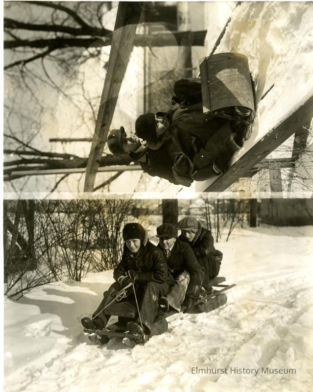 Mike Robins and unidentified boy sledding (in top image) and Dick Hanscom, Jim Coe, and Henry Hanscom sit on a sled (in bottom image)Photograph Details
