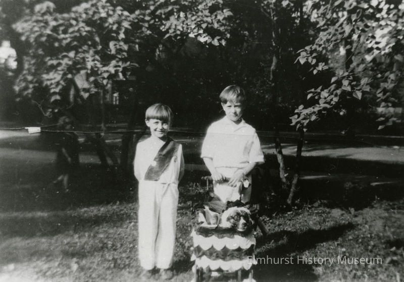 On back: Graue's dog, Mimi, won 2nd prize in Elmhurst Centennial parade, 1936 The children are neighbors of the Graue's