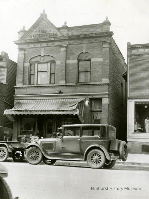 Chipain's Grocery Market with those words on the edge of the striped awning above the front windows and door. Peak of brick building reads "Fred Wandschneider" the name of the man who owned the building and ran a dramshop and boarding house there. Two cars are parked in front of the building.Photograph Details