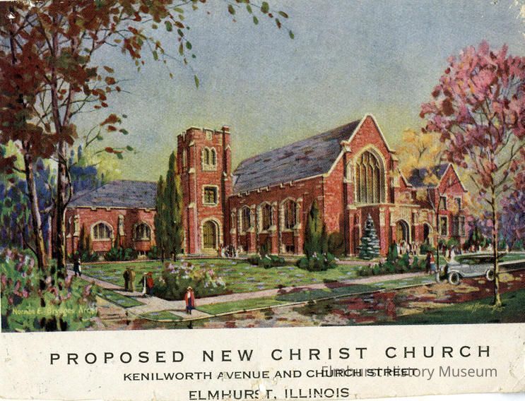 Proposed New Christ Church ( later First Congregational Church U.C.C.) on Kenilworth Avenue and Church Street. The church was designed by Elmhurst architect E. Norman Brydges.Made/Created