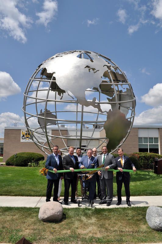 Elmhurst Mayor Steve Morley, aldermen, and owners of Christopher Glass & Aluminum, Inc., cut a ribbon in from of their new headquarters at 832 Industrial Drive. The globe was in front of the Willis Tower in Chicago from 2010-2017.Photograph Details