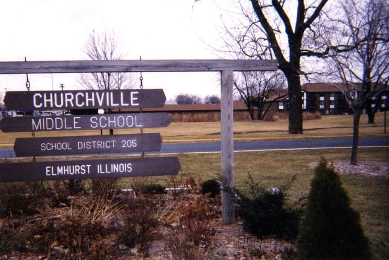 Written in ink on back: 8 Lettering on sign: Churchville / Middle School / School District 205 / Elmhurst Illinois Stamped on back: Osco One Hour Photo / 12 Jan 00