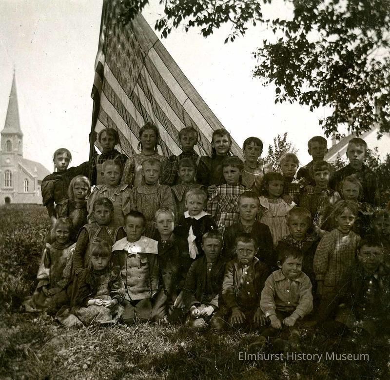 Class photo of Churchville Schoolhouse students. Zion Lutheran Church on Grand Avenue is in the background.Photograph Details