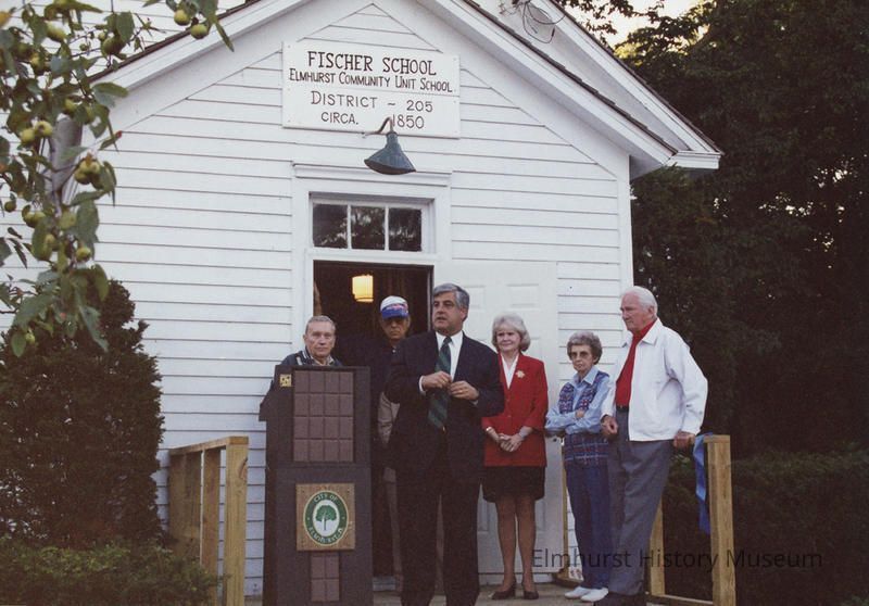Elmhurst Mayor Thomas Marcucci and guests at Churchville Schoolhouse upon the City of Elmhurst's acquisition of it.Photograph Details