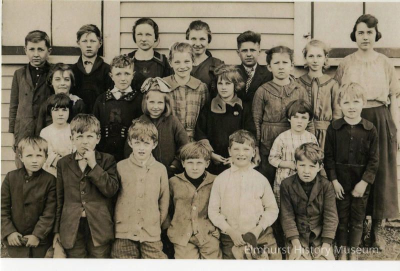 Students at the Churchville one-room schoolhouse and their teacher (back row, right), Miss Frances Case.Photograph Details