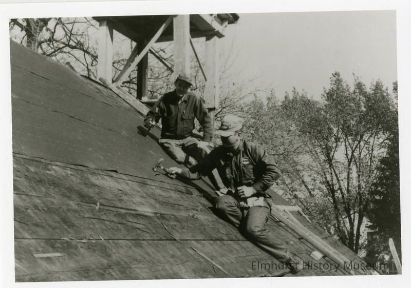 Jim Fischer and W. Fischer repair the roof of the Churchville Schoolhouse as part of a renovation projectPhotograph Details