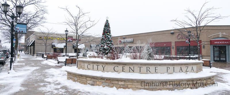City Centre Plaza, at York and Schiller Streets, after a snow storm. A Christmas tree is standing in the plaza.Photograph Details