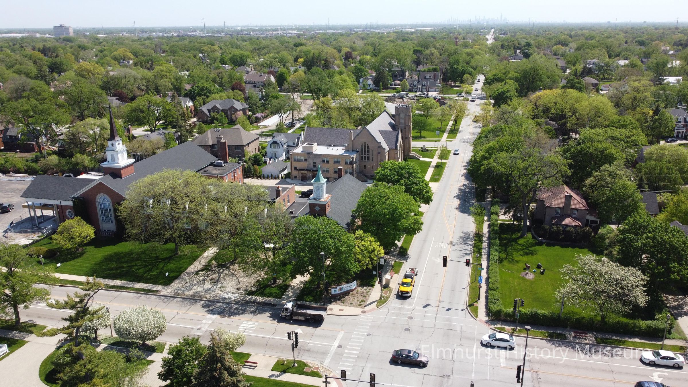Aerial view of Cityview Community Church at 343 S. York Street, on the northeast corner of S. York Street and St. Charles Road, looking east.Photograph Details