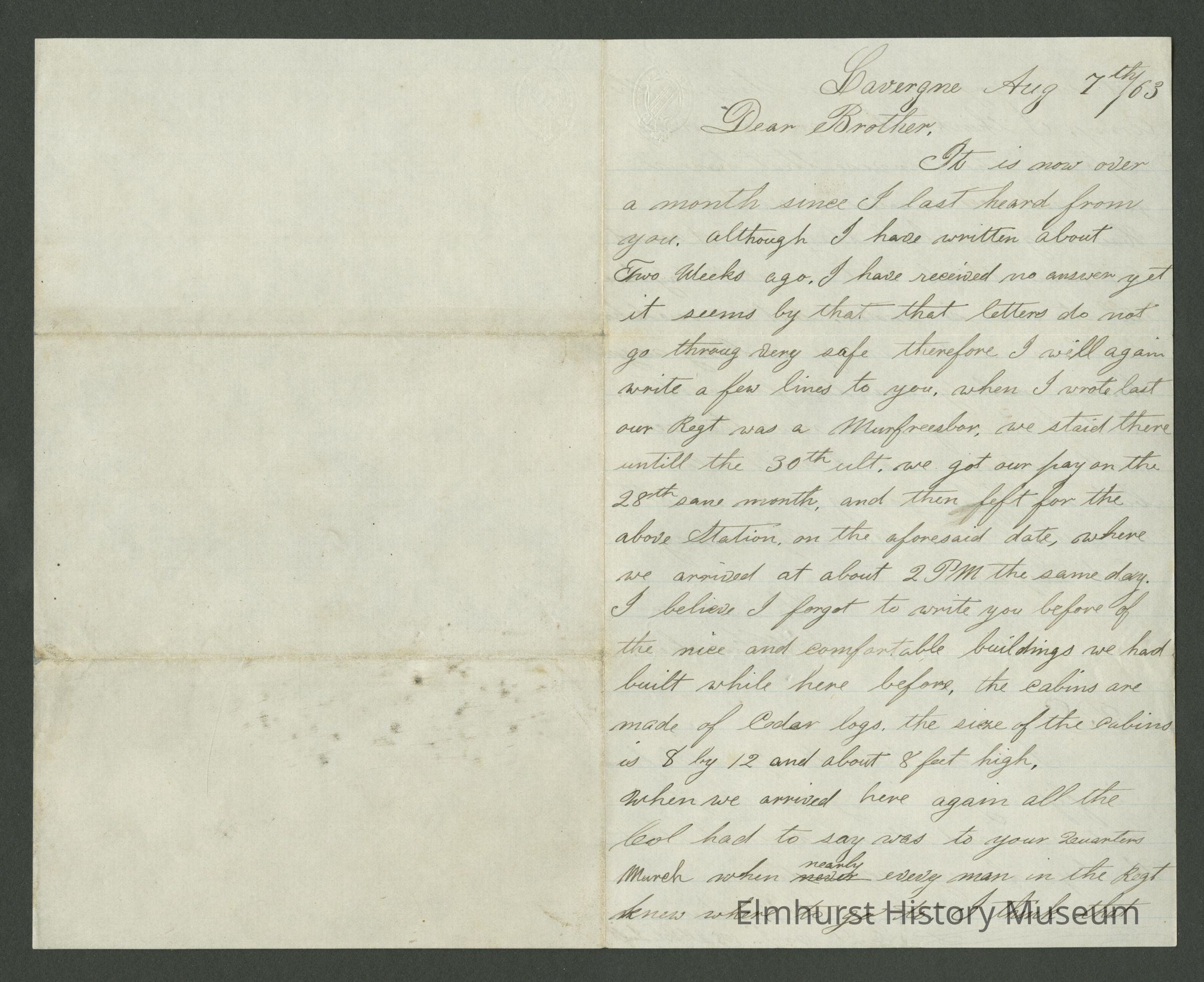 It is now over a month since I last heard from you. although I have written about Two Weeks ago, I have received no answer yet it seems by that that letters do not go through very safe therefore I will again write a few lines to you. when I wrote last our Regt was a Murfreesboro, we staid[sic] there untill[sic] the 30th ult. we got our pay on the 28th same month, and then left for the above Station, on the aforesaid date, where we arrived at about 2 PM the same day. I believe I forgot to write you before of the nice and comfortable buildings we had built while here before, the cabins are made of cedar logs, the size of the cabins is 8 by 12 and about 8 feet high.