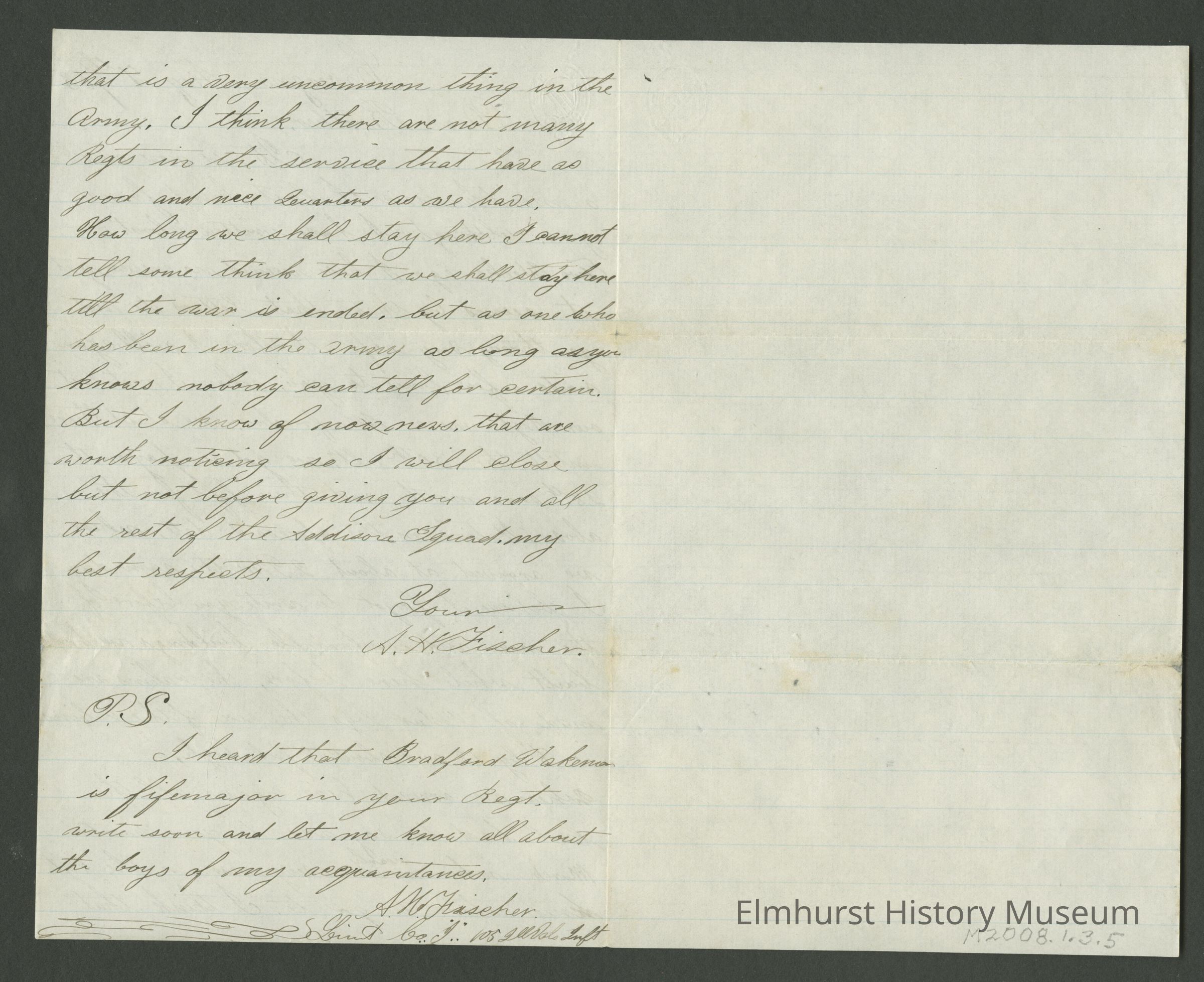 How long we shall stay here I can not tell some think that we shall stay here till the war is ended, but as one who has been in the Army as long as you knows nobody can tell for certain. But I know of no news, that are worth noticing so I will close but not before giving you and all the rest of the Addison Squad, my best respects.