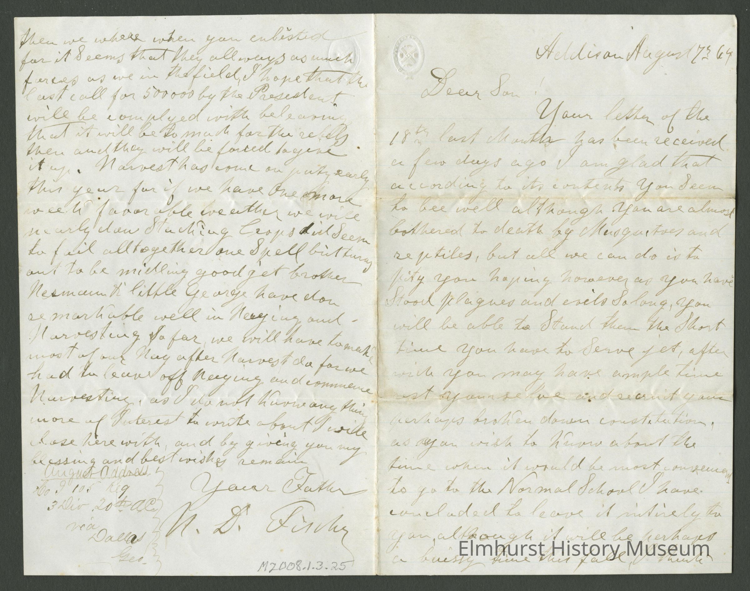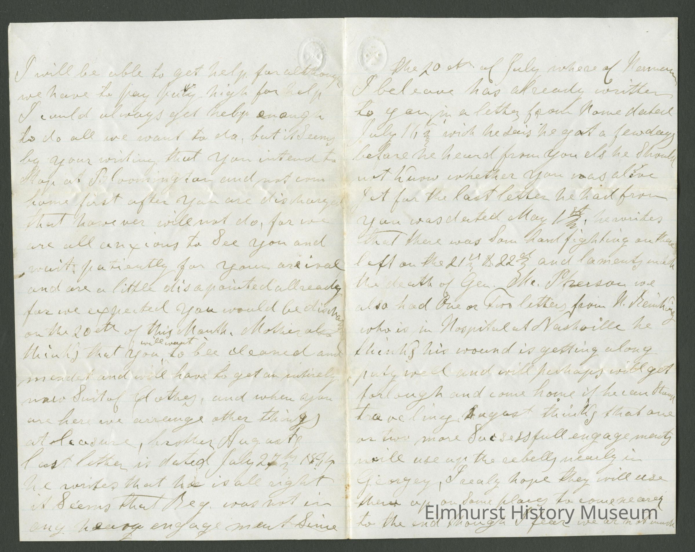 Your letter of the 18th last Month has been received a few days ago. I am glad that according to its contents you Seem to bee [sic] well although you are almost bothered to death by Mosquitoes and reptiles, but all we can do is to pity you hoping however as you have Stood plagues and evils So long, you will be able to Stand them the Short time you have to Serve yet, after which you may have ample time rest yourselve [sic] and [illegible] your perhaps broken down constitution. As you wish to know about the time when it would be most convenient to go to the Normal School I have concluded to leave it intirely [sic] to you, although it will be perhaps a buissy [sic] time this fall, I think I will be able to get help for although we have to pay pretty high for help I could always get help enough to do all we want to do, but it Seems by your writing that you intend to Stay at Bloomington and not com [sic] home first after you are discharged that however will not do, for we are all anxious to See you and wait patiently for your arrival and we are a little disapointed allready [sic] for we expected you would be discharged on the 20th of this Month. Mother also thinks that you will want to be cleaned and mended and will have to get an entirely new Suit of Clothes, and when you are here we arrange other things at leisure, brother August last letter is dated July 27th, 1864. He writes that he is all right it Seems that Reg. was not in any heavy engagement Since the 20th of July where of Herman I believe has already written to you in a letter from home dated July 11, which he says he got a few days before we heard from you else he Should not know whether you was alive. Yet for the last letter we had from you was dated May 1st, he writes that there was Some hard fighting out there left on the 21st & 22nd and laments with the death of Gen. McPherson we also had One or Two letters from H. Reinking who is in the Hospital at Nashville he thinks his wound is getting along pretty well and will perhaps will get forlough and come home if he can Stand traveling. August thinks that one or two more Successful engagements will use up the rebels nearly in Georgia, I really hope they will use them up on Some places to come nearer to the end though I fear we are not much then we where (were) when you enlisted for it Seems that they allways as much forces as we in the field, I hope that the last call for 500,000 by the President will be complyed with believing that it will be so much for the rebels then and they will be forced to give it up. Harvest has come on pretty early this year for if we have one more week favorable weather we will nearly done Stacking Crops. Did Seem to fail alltogether one Spell but turns out to be midling good yet brother Herman & little George have done remarkable well in Haying and Harvesting so far, we will have to make most of our Hay after Harvest for we had to leave off Haying and commence Harvesting, as I do not know anything more of interest to write about I will close here with, and by giving you my blessing and best wishes remain