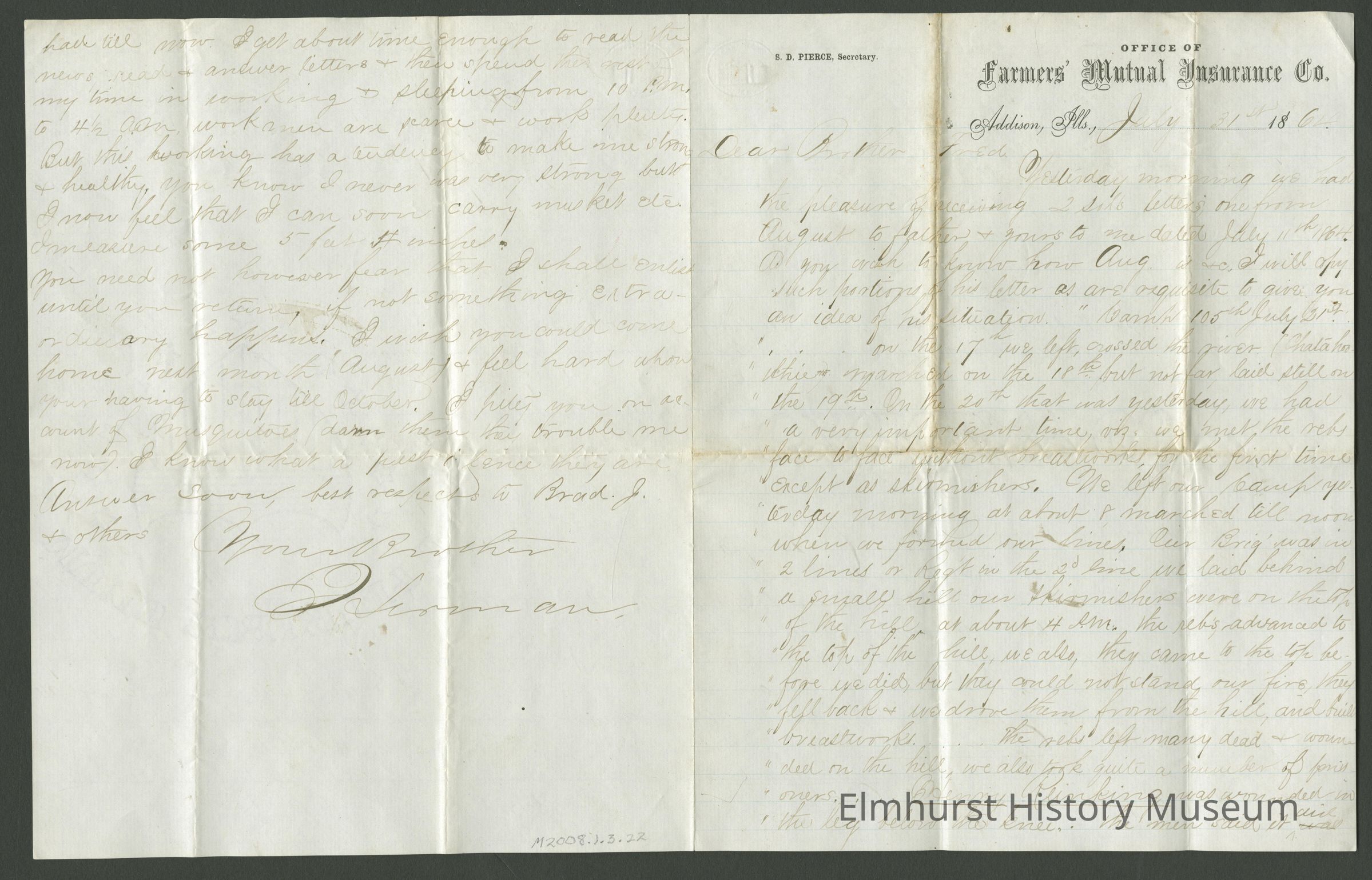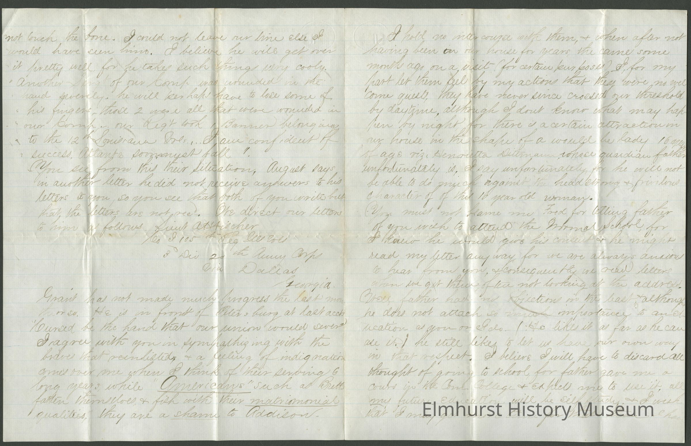 Yesterday morning we had the pleasure of receiving 2 sol’s letters, one from August to father & yours to me dated July 11 1864. As you wish to know how Aug. is & c. I will copy such portions of his letter as are requisite to give you an idea of his situation. “Comp. 105th July 21st … on the 17th we left, crossed the river (Chatahoochie) marched on the 18th but not far, laid still on the 19th. On the 20th that was yesterday, we had a very important time, viz. We met the rebs face to face without breastworks, for the first time except as skirmishes. We left our camp yesterday morning at about 8, marched till noon when we formed our lines. Our Brig. was in 2 lines or Reg’t in the 2nd line we laid behind a small hill our skirmishes were on the top of the hill, at about 4 pm the rebs advanced to the top of the hill, we also, they came to the top before we did, but they could not stand our fire, they fell back & we drove them from the hill, and built breastworks…The rebs left many dead & wounded on the hill. We also took quite a number of prisoners. “Henry Reinking was wounded in the leg below the knee. the men said it did not touch the bone. I could not leave our line else I would have seen him. I believe he will get over it pretty well for he takes such things very cooly. Another Sergt of our Comp. was wounded in the hand severely. he will perhaps have to lose some of his fingers, those 2 were all that were wounded in our Comp., our Reg’t took 1 Banner belonging to the 12th Louisiana Vols.,… I am confident of success. Atlanta soon must fall”