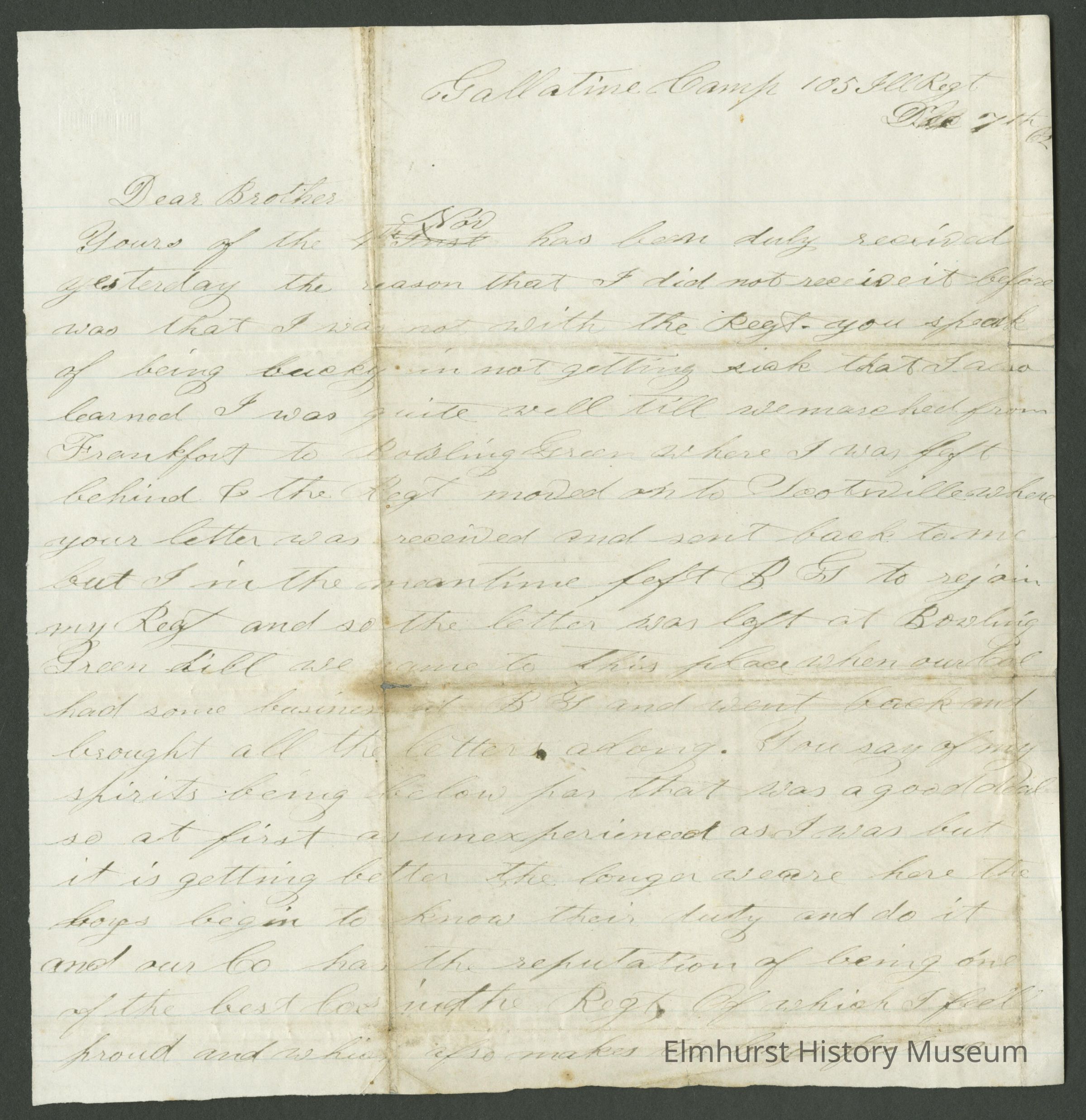 Letter written by 2nd Lt. Augustus Fischer to his brother, Frederick J.T. Fischer who was in the 105th Regiment of the Illinois Infantry. Letter is dated "Dec 7th 62." He writes about mutual acquaintances and his troops getting more experience.Inscription/Signature/Marks