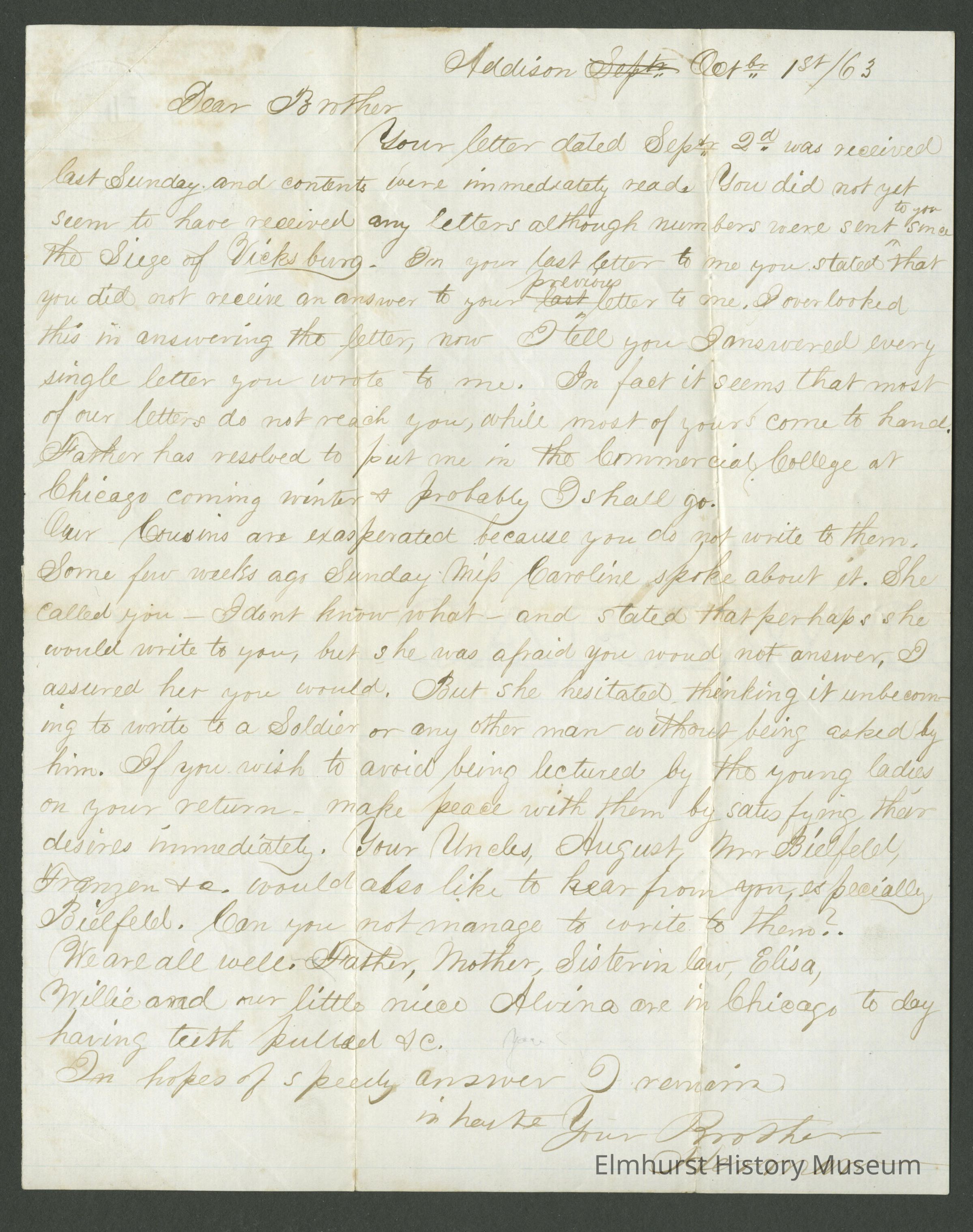 Your letter dated Sep 2d was received last Sunday.and contents were immediately read.You did not yet seem to have received any letters although numbers were sent to you since the Siege of Vicksburg. In your last letter to me you stated that you did not receive an answer to your previous letter to me. I overlooked this in answering the letter, now I tell you I answered every single letter you wrote to me. In fact it seems that most of our letters do not reach you, while most of yours come to hand. Father has resolved to put me in the Commercial College at Chicago coming winter & probably I shall go.
