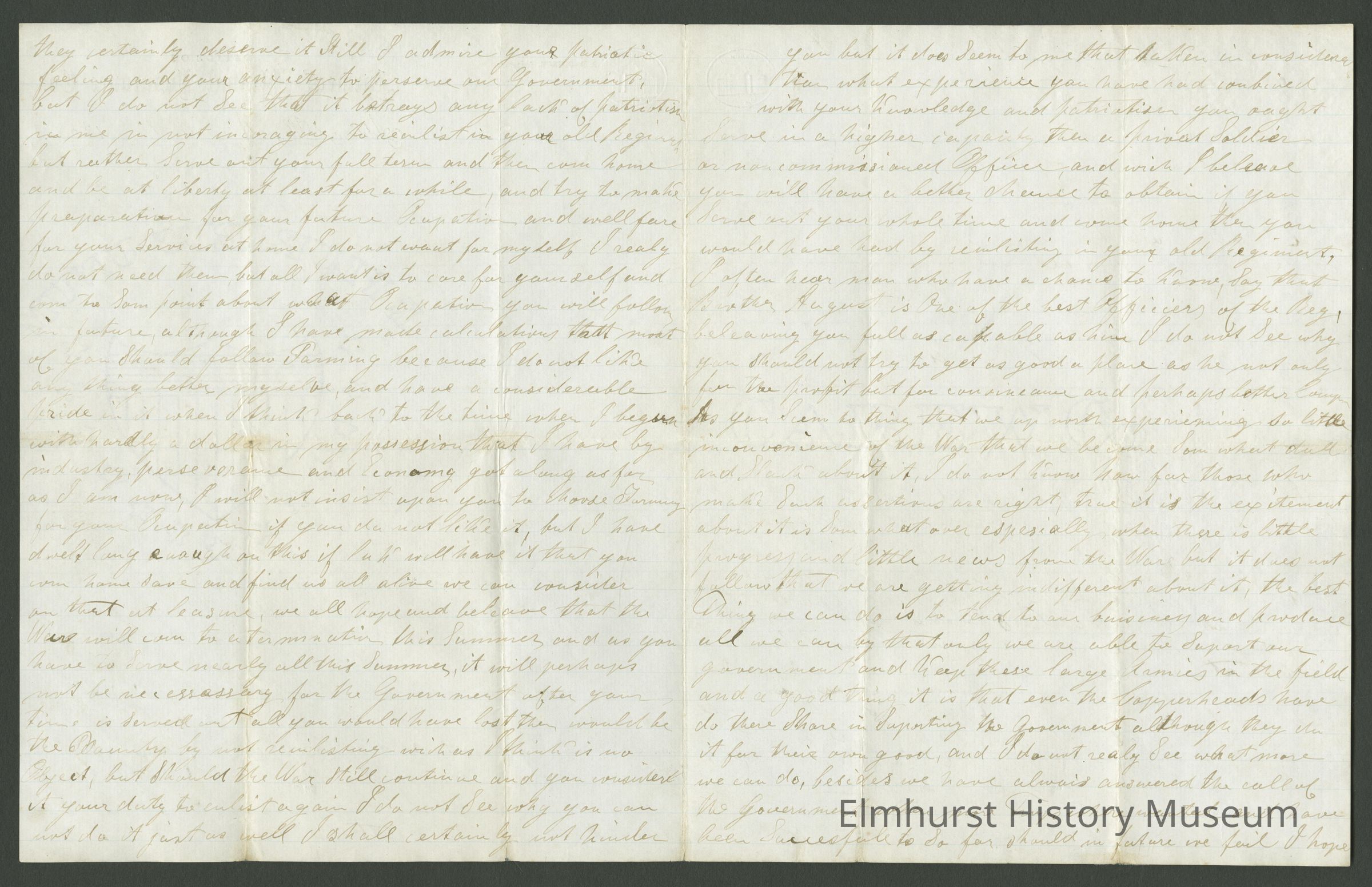 Your letter of the tenth last month I have received a few days ago and perceived with pleasure that at the time you wrote it you seemed to be in good health and spirits, about that letter of mine wich (sic) you mention, and have so much to say I don’t remember much it seems that the principal reason I gave for not wishing you to reenlist was that I wanted your service at home, I will not deny that I perhaps wrote in a manner wich[sic] must lead you to that conclusion and in your case I do not see anything in it wich[sic] would be wrong, for I think that as far as the country is concerned you have done your duty for the present, the Government never needed Volunteers more then at the time you enlisted because ever since they might have filled their Armies by drafting if it had become necessary, that they did not choose to do it, does not make it your duty to serve another term, so that many others who are just as capable as you to serve the country and defend our government and are under the same obligation can stay at home and idle their time away at pleasure or make plans for their future prosperity and comfort, and as for the large bounty the Government now offers is concerned it is no object to me, and I believe it is no object to you though it pleases me that the boys get it they certainly deserve it still I admire your patriotic feeling and your anxiety to perserve[sic] our government, but I do not see that it betrays any lack of patriotism in me in not encouraging to reinlist in your old regiment but rather serve out your full term and then come home and be at liberty at least for a while, and try to make preparations for your future occupation and well fare (sic) for your services at home I do not want for myself I realy (sic) do not need them, but all I want is to care for yourself and come to som(sic) point about what occupation you will follow in future, although I have made calculations that most of you should follow farming because I do not like anything better myself, and have a considerable pride in it when I think back to the time when I begun with hardly a dollar in my possession that I have by industry, perserverance and economy got along as far as I am now, I will not insist upon you to choose farming for your occupation if you do not like it, but I have dwelt long enough on this if luck will have it that you com (sic) home safe and find us all alive we can consider on that at leasure (sic) we all hope and beleave (sic) that the war will come to a termination this summer, and as you have to serve nearly all this summer, it will perhaps not be necessary for the government after your time is served out all you would have lost then would be the country by not reinlisting wich (sic) as I think is no object, but should the war still continue and you consider it your duty to enlist again I do not see why you can not do it just as well I shall certainly not hinder you but it does seem to me that taken in consideration that what experience you have had combined with your knowledge and patriotism you ought serve in a higher capacity then (sic) a private soldier or non commissioned officer, and wich (sic) I believe you will have a better chance to obtain if you serve out your whole time and come home then you would have had by reinlisting in your old regiment, I often hear men who have a chance to know, say that brother August is one of the best officers of the Reg, beleaving (sic) you full as capable as him I do not see why you should not try to get as good a place as he not only for the profit (?) but for convenience and perhaps better comp(?) as you seem to think that we up north experiencing so little inconvenience of the war that we become some what dull and slack about it, I do not know how far those who make such assertions are right, true it is the excitement about it is some what over especially when there is little progress and little news from the war but it does not follow that we are getting indifferent about it, the best thing we can do is to tend to our buisiness (sic) and produce all we can by that only we are able to suport (sic) our government and keep these large armies in the field and a good thing it is that even the Copperheads have do their share in supporting the government although they do it for their own good, and I do not realy (sic) see what more we can do, besides we have alwais (sic) answered the call of the government when more troops were wanted and have been succesfull (sic) to so far should in future we fail I hope the government resort to a draft at once, for I should really like to see, cowardly young man who seem to care for nothing else then for their own comfort forced to serve in the Army which will certainly do them good for it will teach them that they can do without their Mother one time as well as another not knowing anything particular which would interest you I will allude to one family matter and close at present we are all well, Mother is sometimes troubled with headache but not so much as she used to, my health seems to have been declining the last two years and although I do not suffer from ill health I do not believe I will get very old, Henry and his family lives with us yet but will perhaps leave after sowing and planting is done with may as we had late by march rain that sum (sic) time Herman is still going to school but will stay at home as soon as we are able to work in the field presently it is so wet and muddy that we can do but little, knowing that it will be very inconvenient for me that Henry is a going to leave I did depend up on you to take his place by your last letter it seems do that you do not agree with me, I beleave(sic) that you right enough, but beleave(sic) also that we can not all be soldiers for this war cannot alone be settled by battles it wants its time, and I have no doubt that in time if are able to supply our Armies with man provisions and all other necessasseries(sic) and support our government an