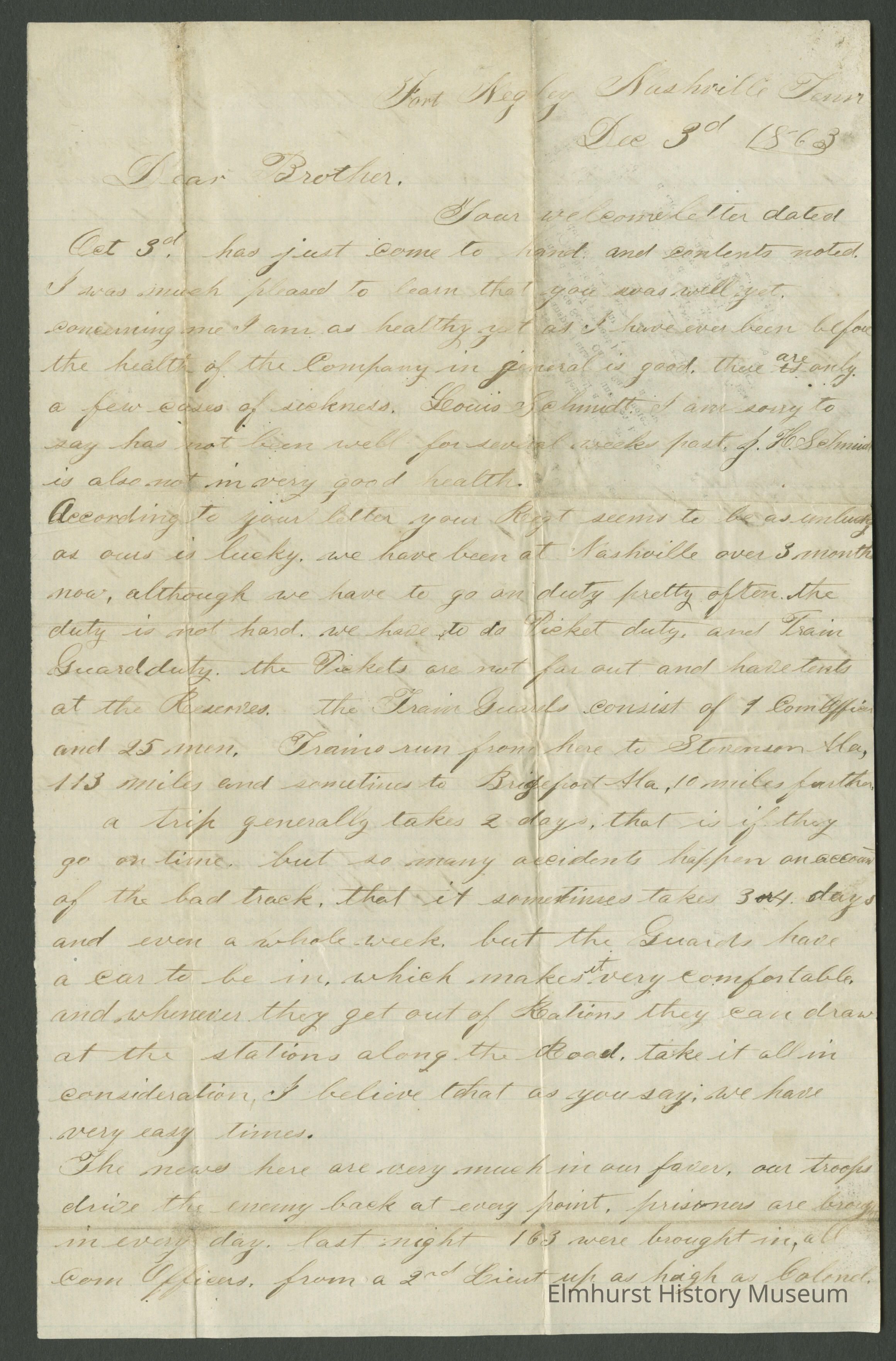 According to your letter your Regt seems to be as unlucky as ours is lucky, we have been at Nashville over 3 months now, although we have to go on duty pretty often the duty is not hard. we have to do Picket duty, and Train Guard duty. the Tickets are not far out and have tents at the Reserves. the Train Guards consist of Com. Officer and 25 men. Trains run from here to Stevenson Ala, 113 miles and sometimes to Bridgeport Ala, 10 miles further. a trip generally takes 2 days, that is if they go on time but so many accidents happen on account of the bad track, that it sometimes takes 3 or 4 days and even a whole week, but the Guards have a car to be in, which makes it very comfortable, and whenever they get out of Rations they can draw at the stations along the Road, take it all in consideration, I believe that as you say we have very easy times.