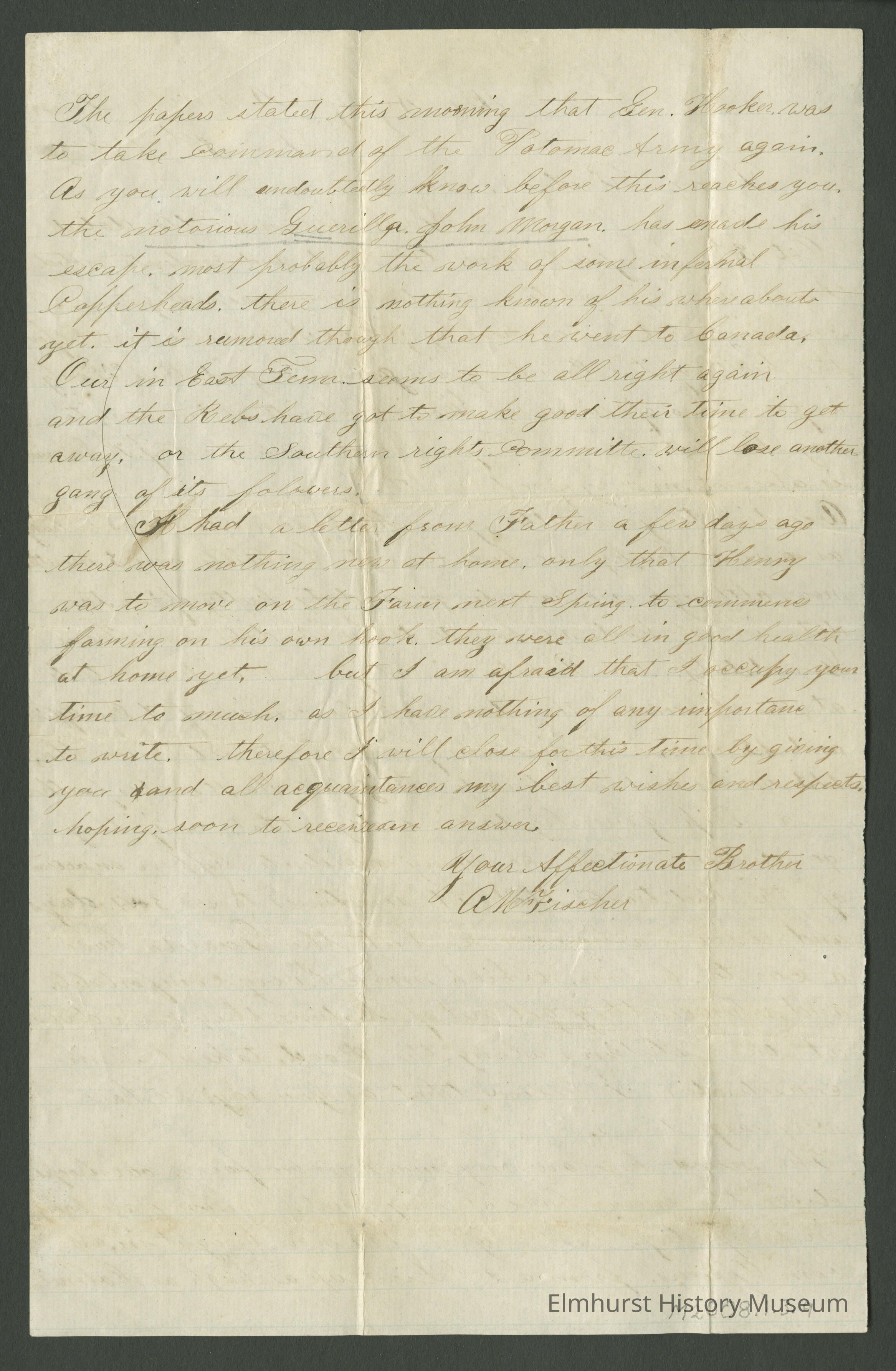The news here are very much in our faver[sic], our troops drive the enemy back at every point, prisoners are brought in every day, last night 103 were brought in, all Com Officers, from a 2nd Lieut up as high as Colonel. The papers stated this morning that Gen. Hooker was to take command of the Potomac Army again. As you will undoubtedly know before this reaches you, the notorious Guerilla John Morgan, has made his escape most probably the work of some infernal Copperheads, there is nothing known of his whereabouts yet, it is rumored though that he went to Canada.