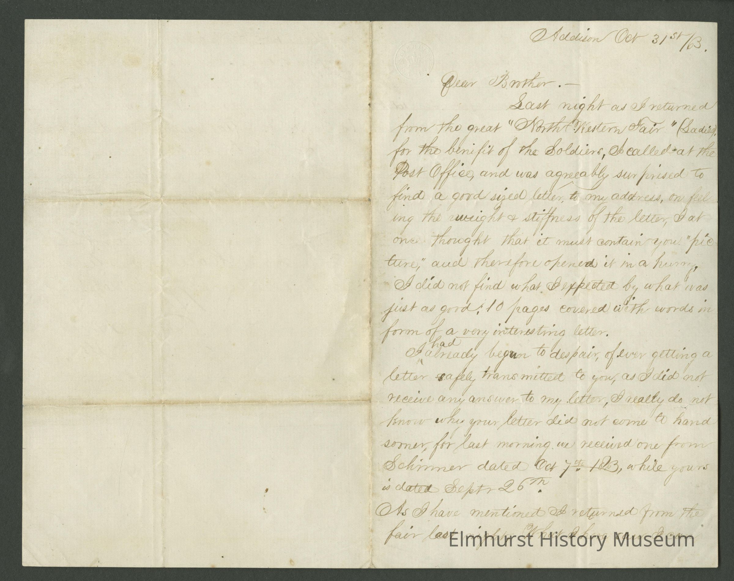 Last night as I returned from the great “North Western Fair”(Ladies), for the benifit (sic)of the Soldiers, I called at the Post Office, and was agreeably surprised to find a good sized letter, to my address, on feeling the weight and stiffness of the letter, I at once thought that it must contain your “picture,” and therefore opened it in a hurry, I did not find what I expected by what was just as good: 10 pages covered with words in form of a very interesting letter.