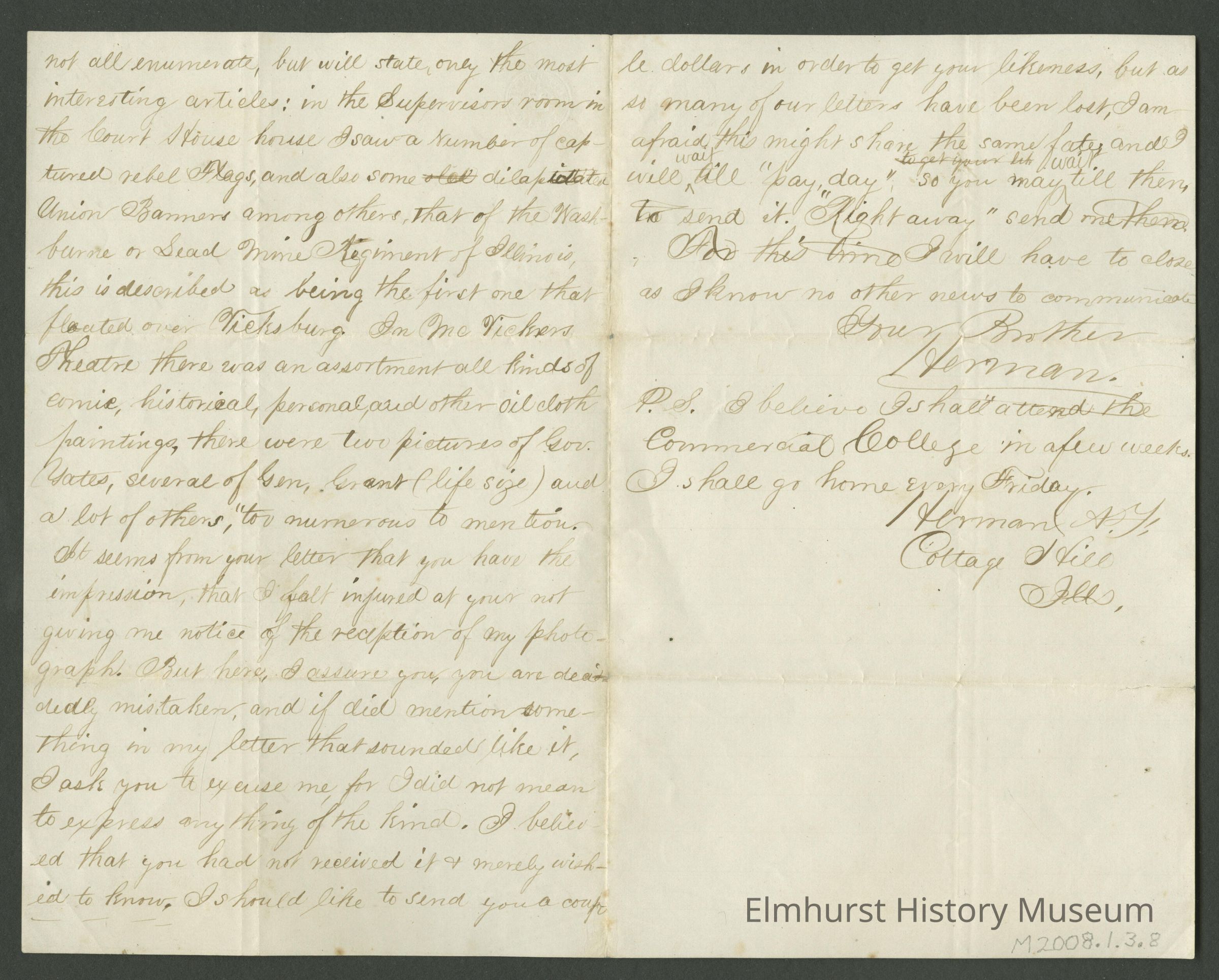 As I have mentioned I returned from the fair last night. What I here saw I can not all enumerate, but will state only the most interesting articles: in the Supervisors room in the Court House house I saw a number of captured rebel Flags, and also some dilapidated Union Banners among others, that of the Washburne or Lead Mine Regiment of Illinois, this is described as being the first one that floated over Vicksburg In McVickers Theatre there was an assortment all kinds of comic, historical, personal, and other oil cloth paintings, there were two pictures of Gov. Yates, several of Gen. Grant (life size) and a lot of others, “too numerous to mention. It seems from your letter that you have the impression that I felt injured at your not giving me notice of the reception of my photograph. But here, I assure you, you are decidedly mistaken, and if did mention some-thing in my letter that sounded like it, I ask you to excuse me, for I did not mean to express anything of the kind. I believed that you had not received it & merely wished to know. I should like to send you a couple dollars in order to get your likeness, but as so many of our letters have been lost, I am afraid this might share the same fate and I will wait till “pay, day” so you may wait till then, to send it. “Right away” send me one then.