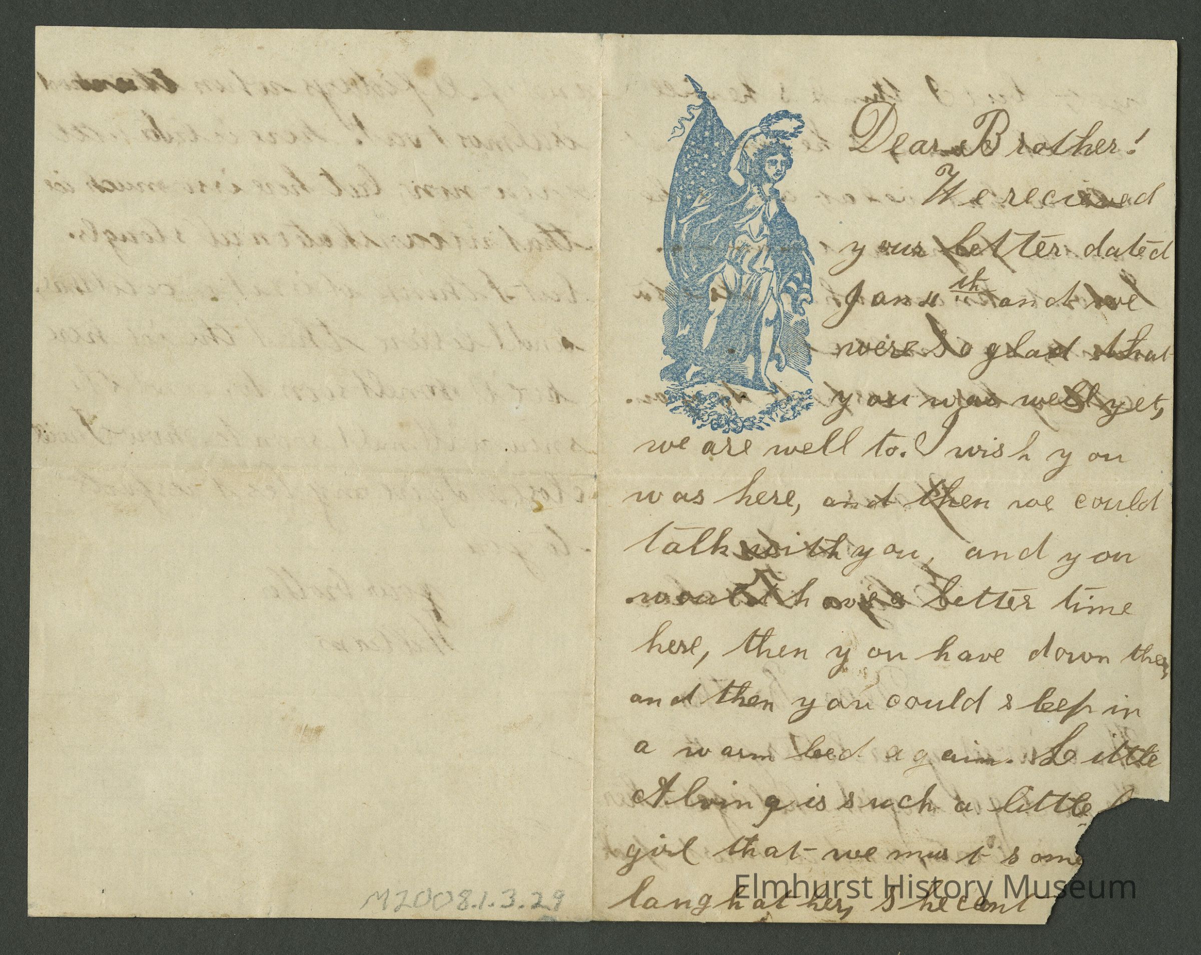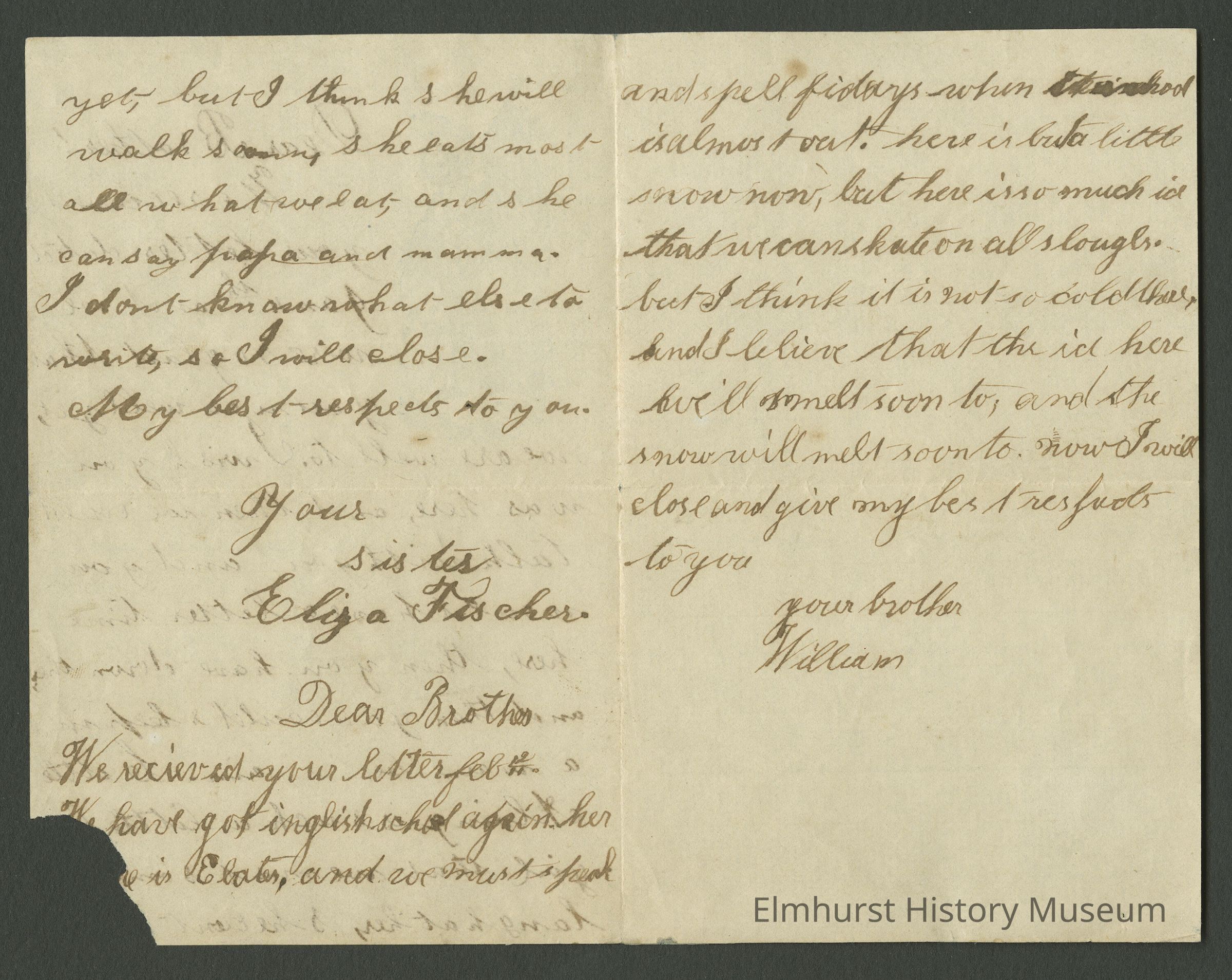 We received your letter feb.___. We have got inglish school again here ________is Elater, and we must speak and spell Fridays when the school is almost out. Here is but a little snow now, but here is so much ice that we can skate on all sloughs. But I think it is not so cold here and I believe that the ice here will melt soon to. Now I will close and give my best respects to you.