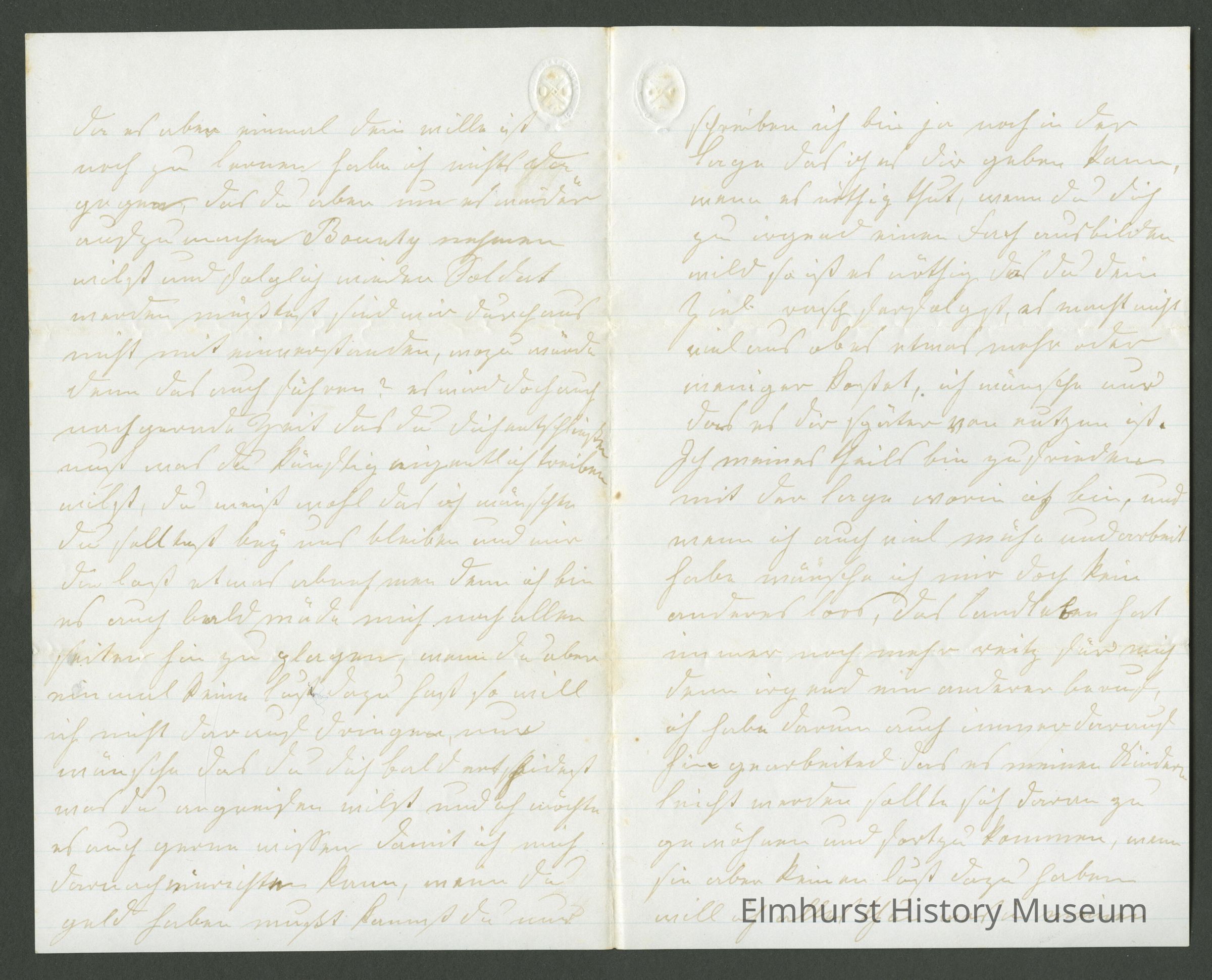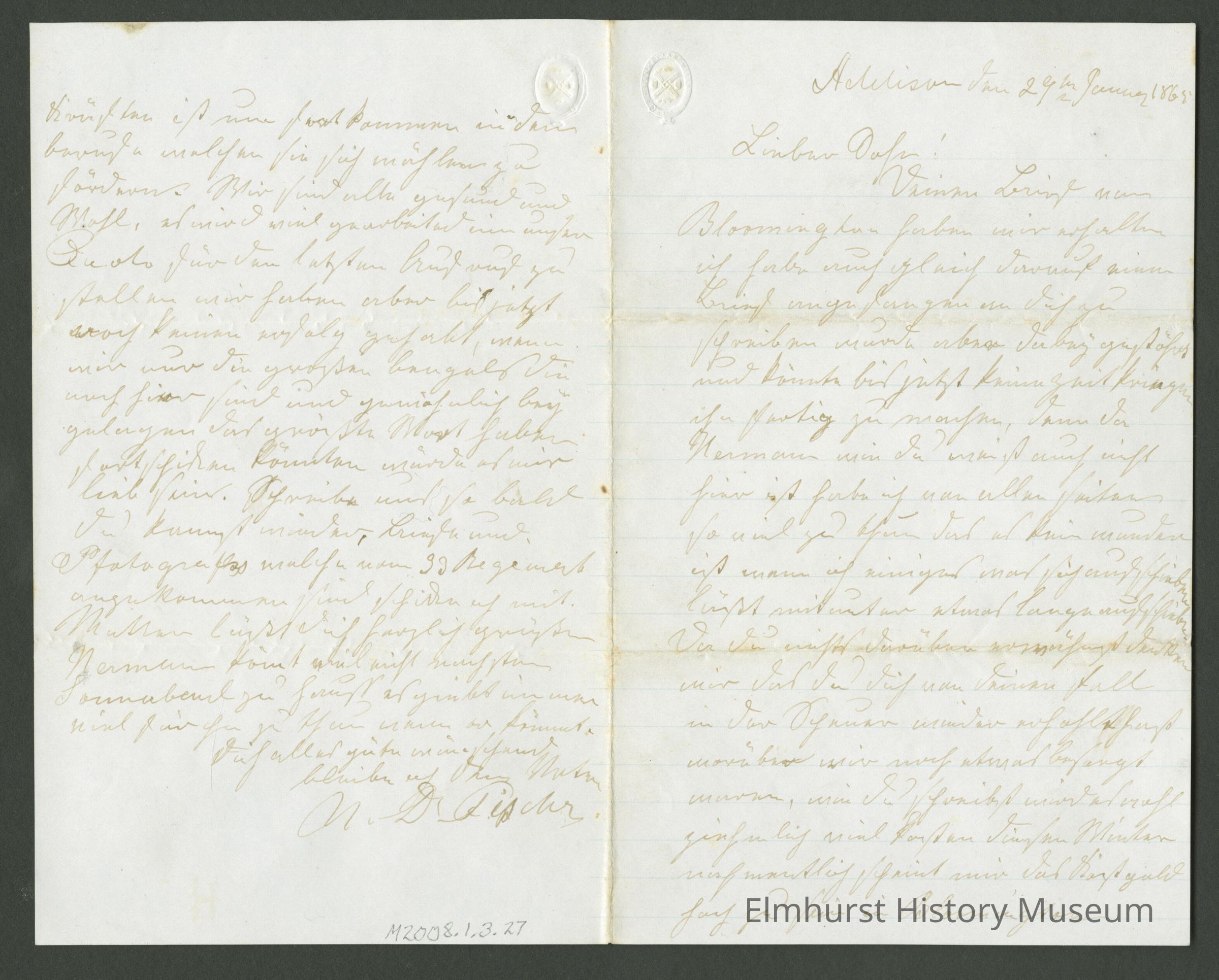 We got your letter from Bloomington. As soon as we got it, I began a letter to you, but was interrupted and have not, until now, had time to finish it. Since, as you know, Hermann is no longer here I have things to do on all fronts, which explains why I push things aside that are not urgent. We are assuming that you are better now, because you are no longer writing about your fall in the barn, which had us rather worried. According to your letter, it will cost a lot this winter {,} especially in Bloomington the prices seem high. I have nothing against you continuing you studies, but since you would have to go into debt, which would mean becoming a soldier again, we do not agree in the least. What would be the point of that? It is also high time that you finally decide what you will do for a living. You already know that I want to stay with us, to take some of the weight off my shoulders, since I am growing tired of having to run in every direction at once. If you do not want to become a farmer, I will not insist upon it {.} The only thing is that I would like you to decide soon what you will do for a living {;} I would also like to know what you decide so I can act accordingly. If it is money you need, all you have to do is write, since I am still in a position to simply give it to you, if you need it. If there is some profession in which you want to prepare yourself, ten you should pursue your goal soon. It matters little if it costs more or less, I only want it to be useful in the future. I, at least, am satisfied with my position, and even when I have a lot of work and effort to put in, I would not wish it to be different. Life in the country has always stimulated me more than any other profession. Therefore, I have worked hard to make it easy for my children to get used to farming and to make progress through it. If they have no desire to be farmers, I will do everything in my power to support them in the profession that they choose. We are all healthy and well, and are working a hard to meet the quota for the last order, but have had no success so far. I would love if I just could send away the big guys who are still here who have the biggest mouth at celebrations. Write as soon as you are able. I will forward the letters and photos from the 33rd Regiment that have come for you so far. Mother sends her heartfelt greetings. Hermann will perhaps come home next Sunday, and there is always enough for him to do.