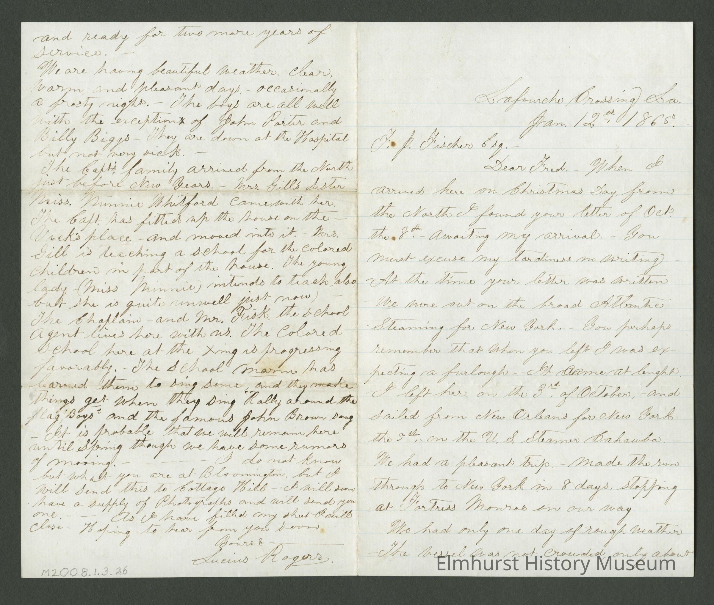 Dear Fred. – When I arrived here on Christmas Day from the North I found your letter of Oct. the 8th awaiting my arrival. You must excuse my tardiness in writing. At the time your letter was written we were out on the broad Atlantic Steaming for New York. You perhaps remember that when you left I was expecting a furlough. It came at length. I left here on the 3rd of October and sailed from New Orleans for New York the 5th on the U.S. Steamer Cahawba. We had a pleasant trip – made the run through to New York in 8 days, stopping at Fortress Monroe on our way.