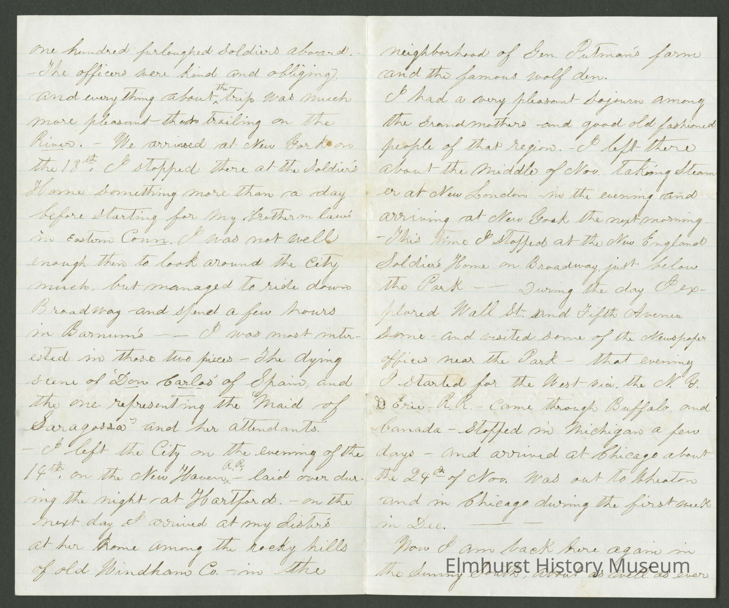 I had a very pleasant sojourn among the grandmothers and good old fashioned people of that region. I left there about the middle of Nov. taking Steamer at New London in the evening and arriving at New York the next morning. This time I stopped at the New England Soldier’s Home on Broadway, just below the Park.—During the day I explored Wall St. and Fifth Avenue some and visited some of the Newspaper offices near the Park – that evening I started for the West via N. E. & Erie R.R. came through Buffalo and Canada – stopped in Michigan a few days – and arrived at Chicago about the 24th of Nov. Was out to Wheaton and in Chicago during the first week in Dec.