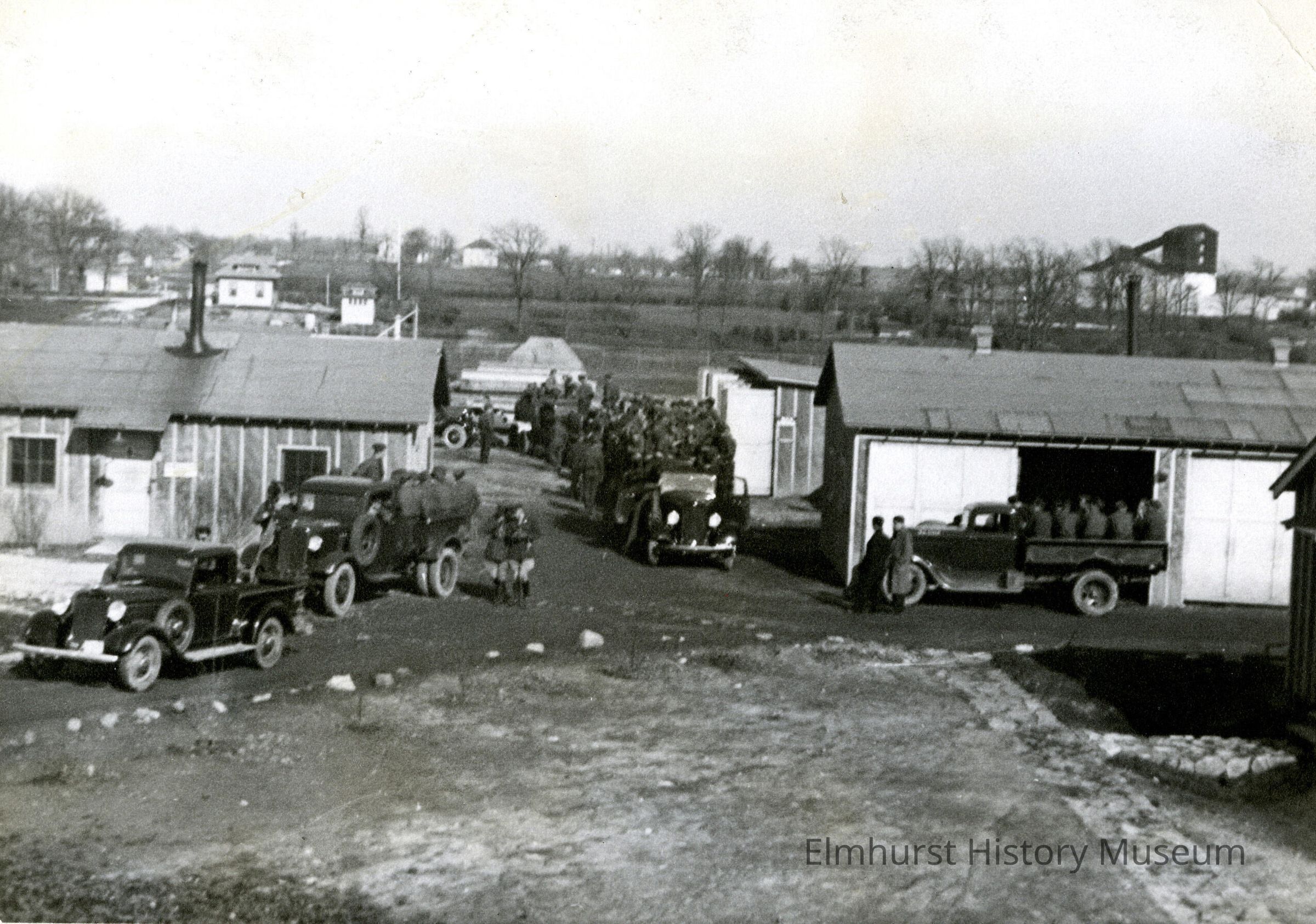 Photograph. Trucks carrying members of the Civilian Conservation Corps from Camp Elmhurst. The tower from the Elmhurst Chicago Stone Co. is visible in the right background.Made/Created