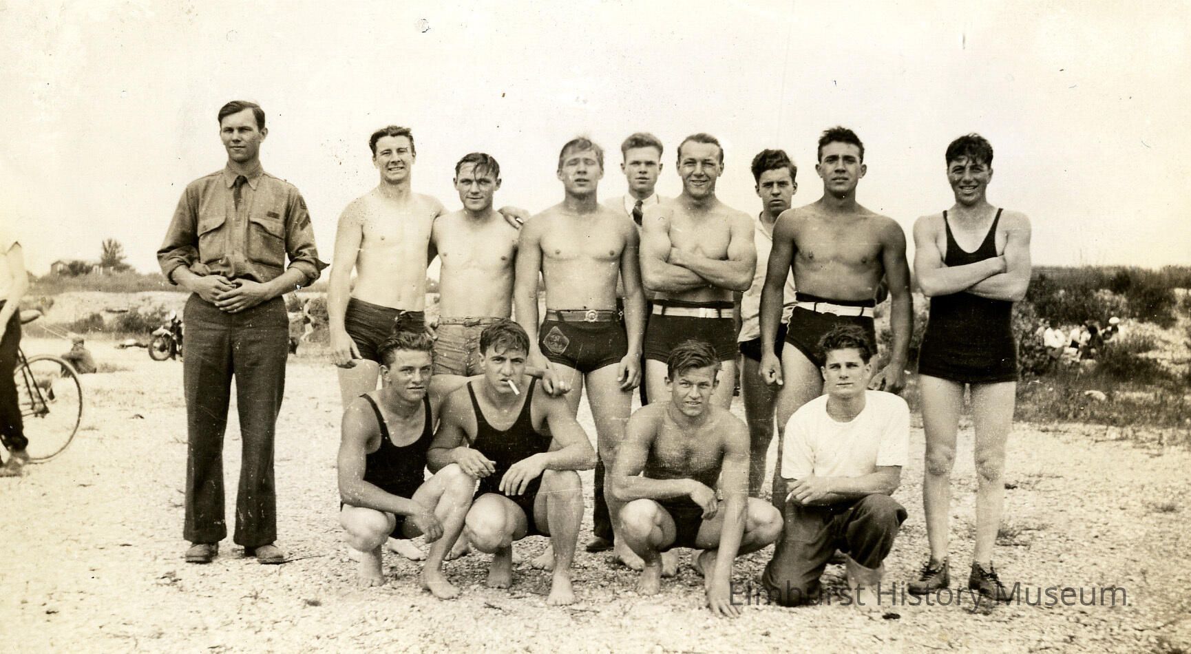 A group of CCC men in swimsuits. Mike DeFillipo, the creator of this Camp Elmhurst album, is identified as second man from the right, dressed in bathing trunks and standing.Made/Created
