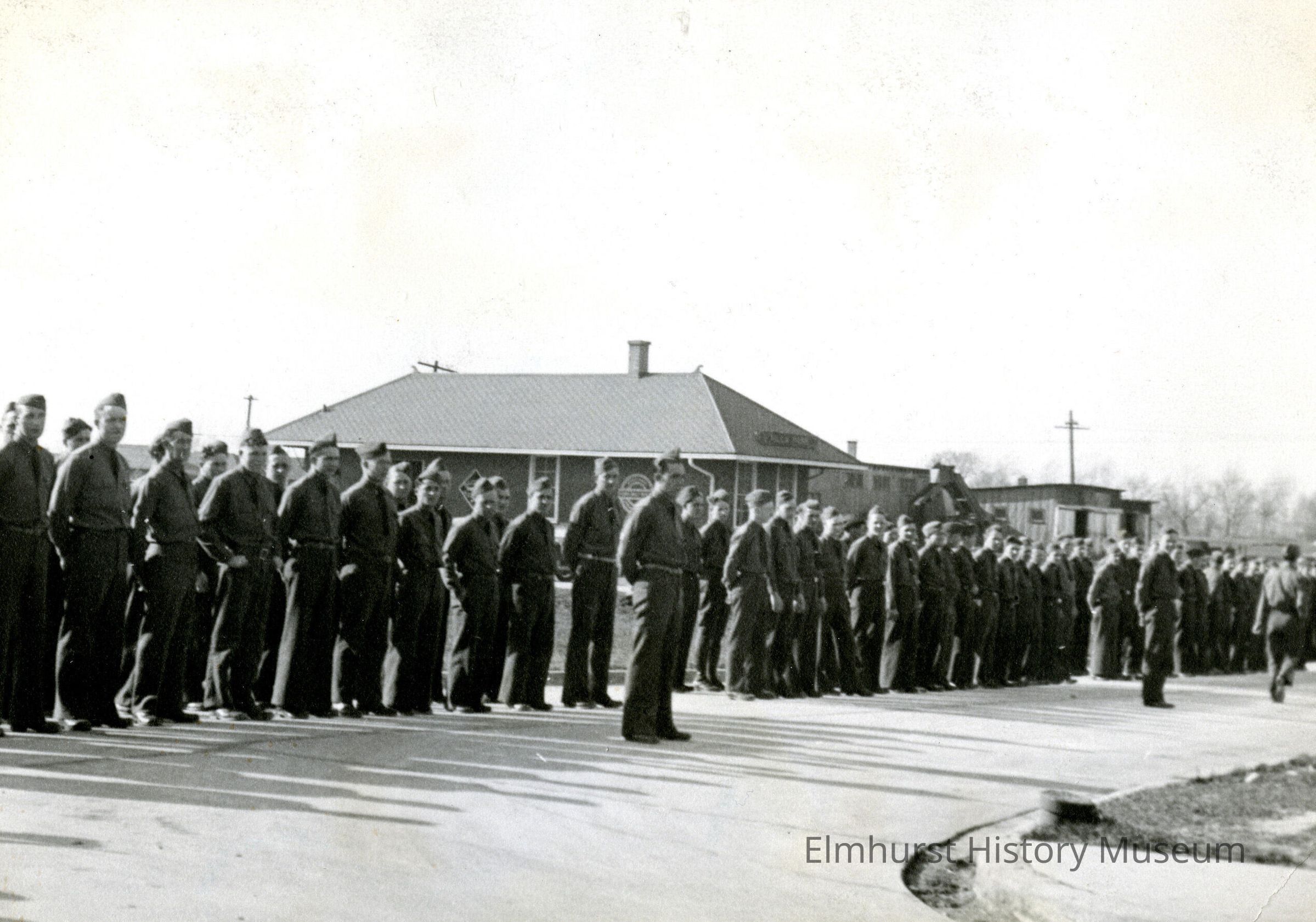 CCC Camp Elmhurst Company 2602 standing at attention in front of the depot in Villa Park.Made/Created