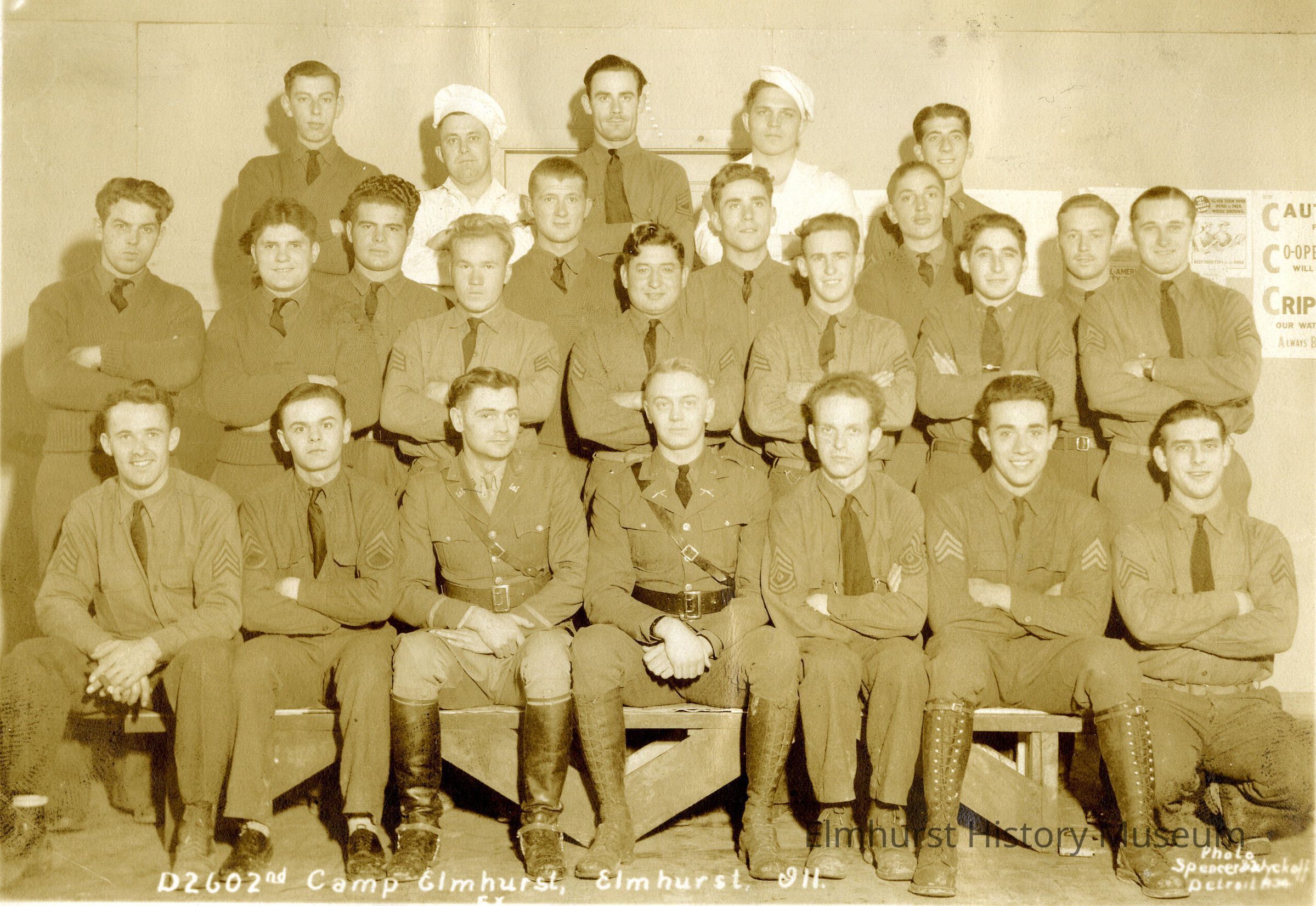 Across the bottom hand-lettered caption reads in white "D2602nd Camp Elmhurst, Elmhurst. Ill." and in right-hand lower corner "Photo Spencer & Wyckoff Detroit 1934."