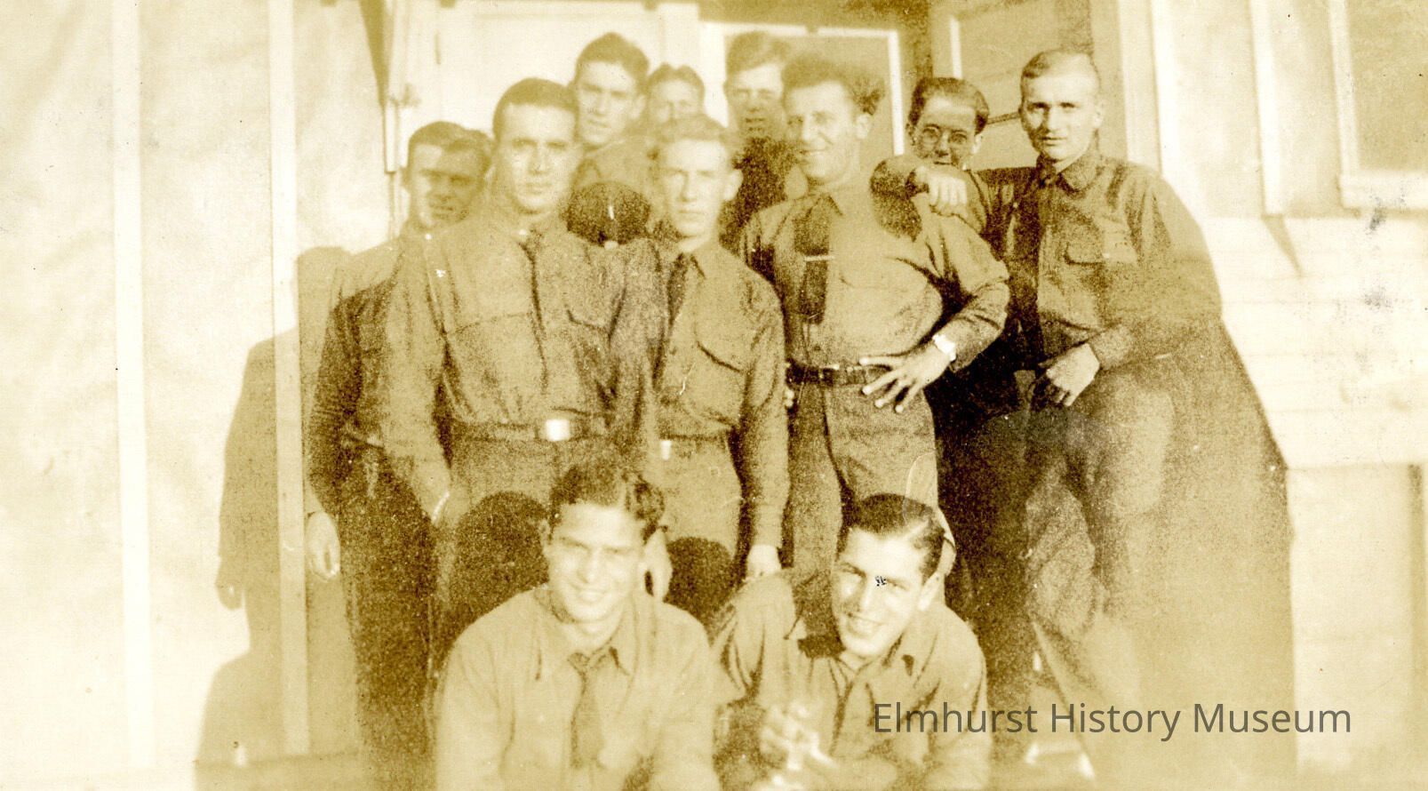 Group portrait of 11 uniformed CCC men loosely grouped in front of a doorway. (Note: Michael DeFillipo, the creator of this album, is the man in the middle in the third photo and the man in the second row on the left in the bottom print.)Made/Created