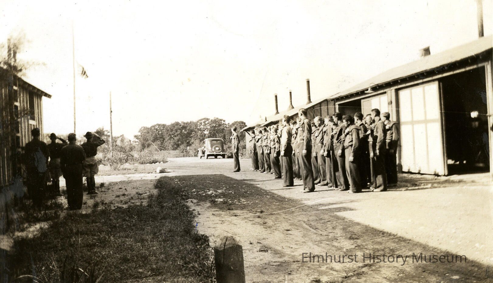 CCC Camp Elmhurst men standing at attention, lined up in front of buildings as the U.S. flag is raised or lowered.Made/Created