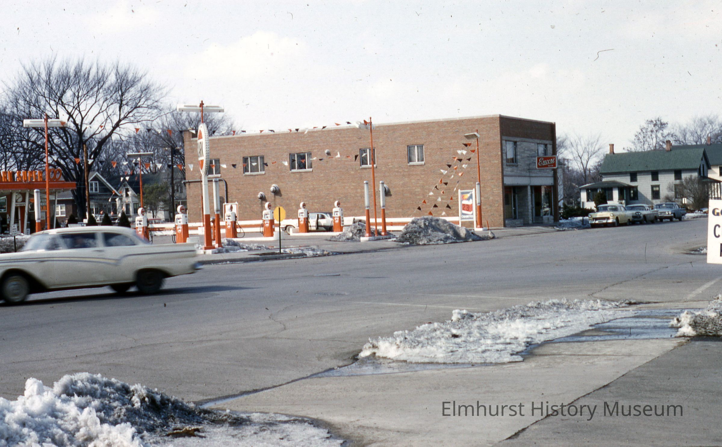Looking northwest on Addison Avenue at Second Street, viewing the Clark Gas Station at 168 N. Addison and Koenig Tavern at 172 N. AddisonPhotograph Details