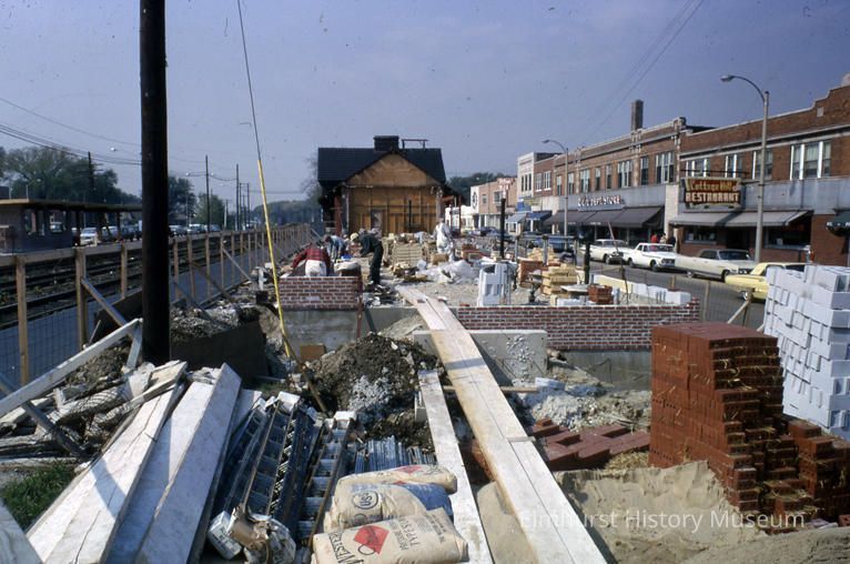 Construction of Chicago and North Western train depot on First Street looking west. The original 1894 train station can be seen in the background.Photograph Details