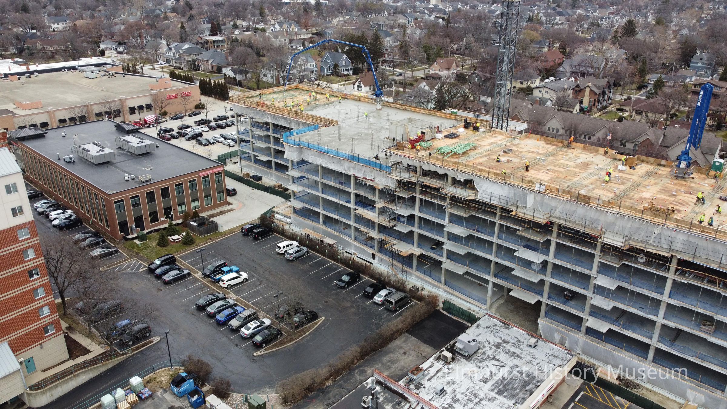 View of the construction of the Vyne on Haven apartment complex at 100 N. Haven Road, looking northeast towards Schiller Street. Elmhurst-Edward Health Clinic is at left.Photograph Details