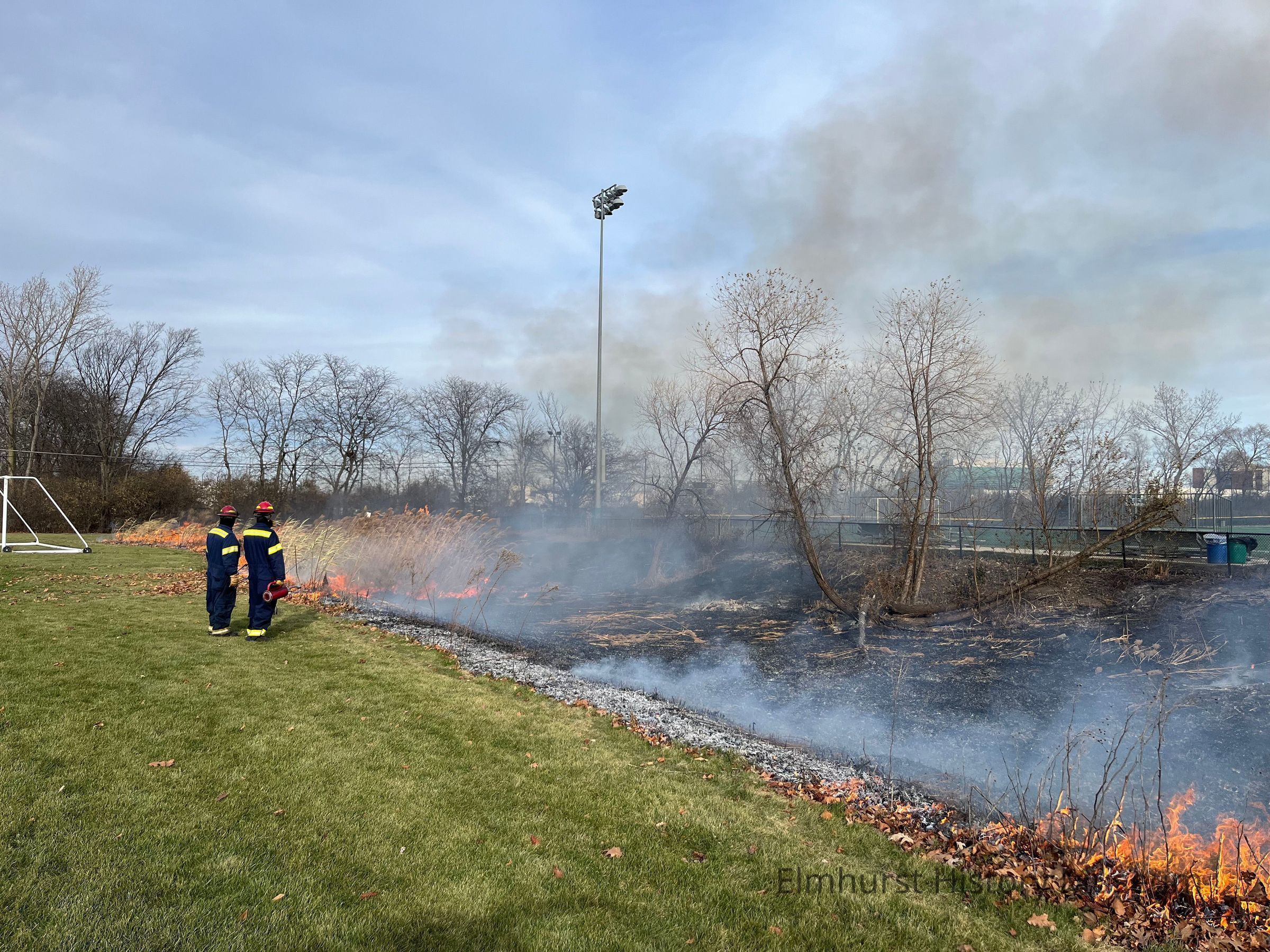 Controlled burn in the prairie areas at Berens Park by the Elmhurst Park District.Photograph Details