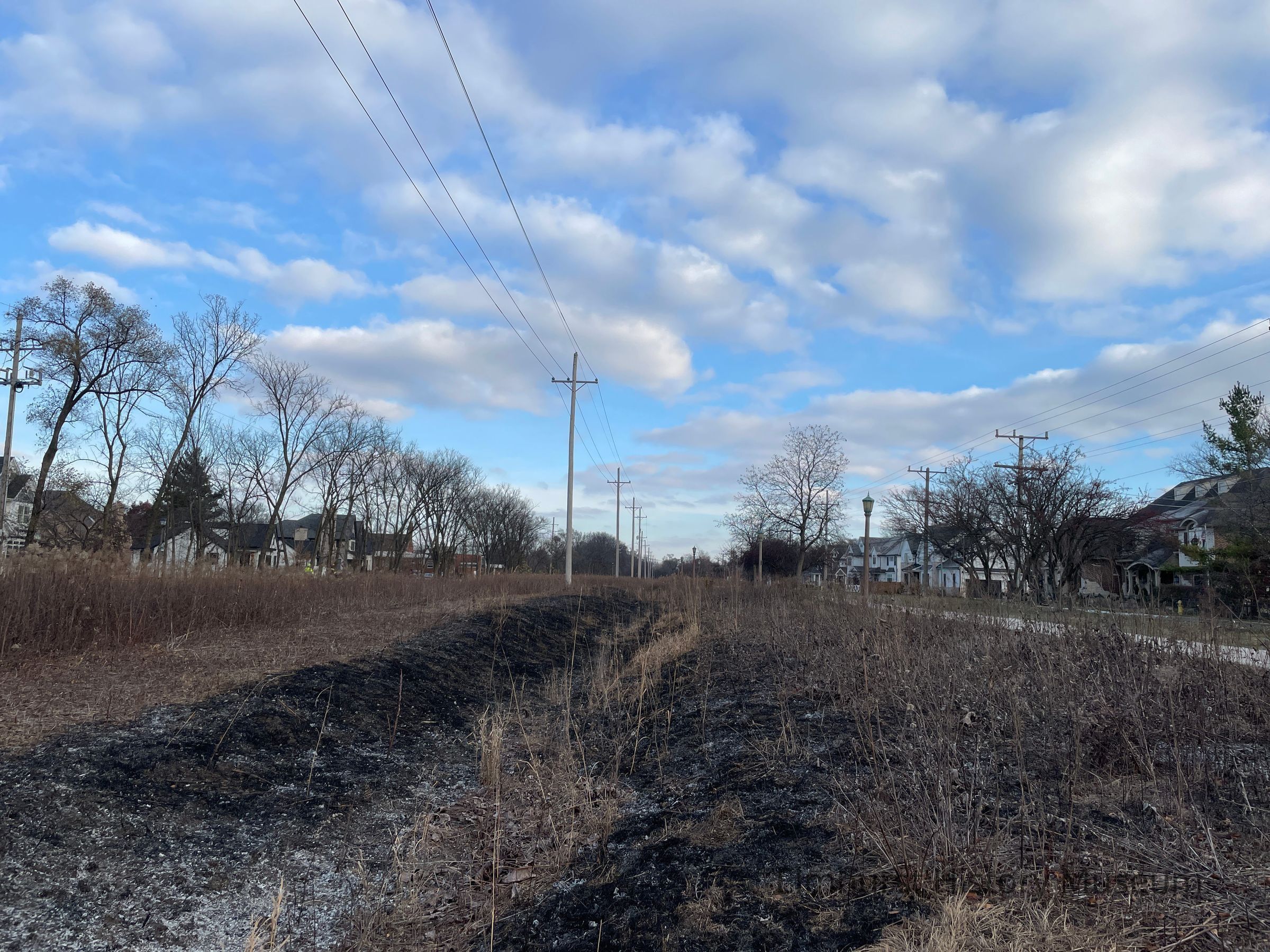 Controlled burn areas at the Keith A. Olsen Prairie along the Prairie Path by the Elmhurst Park District.Photograph Details