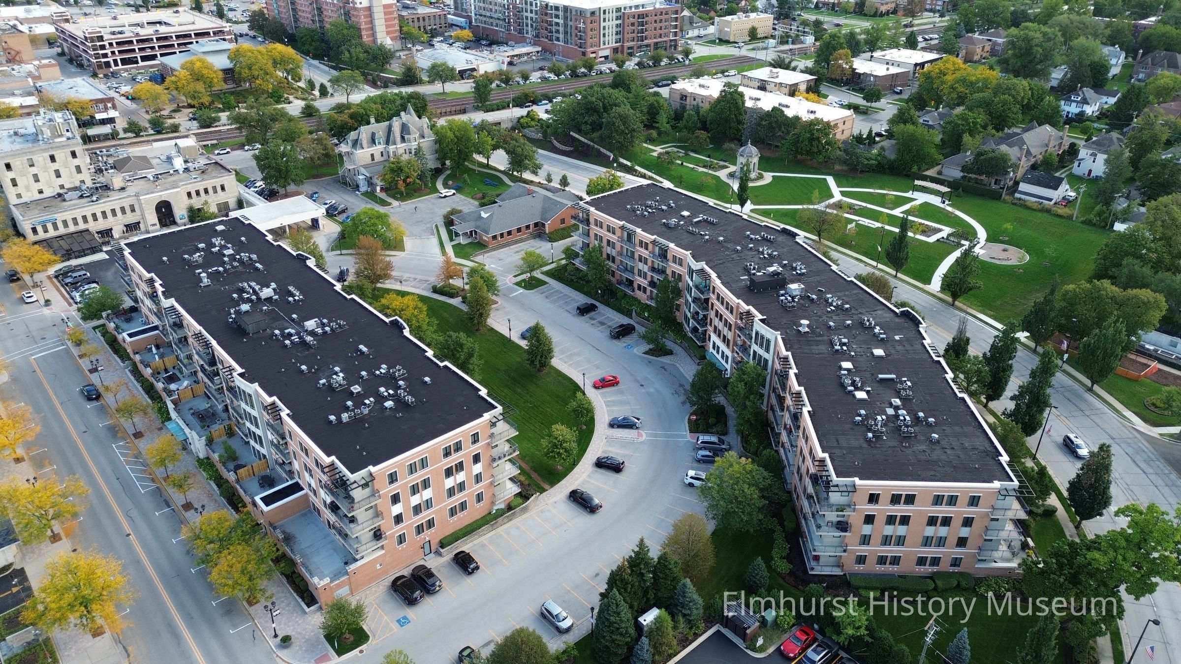 Aerial view of Crescent Court Condominiums on S. York Street, looking northeast. The Elmhurst History Museum and Glos Memorial Park is visible in the background.Photograph Details