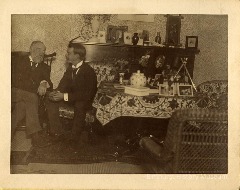 Henry W. King (left) and his son-in-law Cyrus Bentley in the King home. Mr. King and his wife, Aurelia Case King, lived in what is now known as the Wilder Mansion circa 1887 - circa 1900.Photograph Details