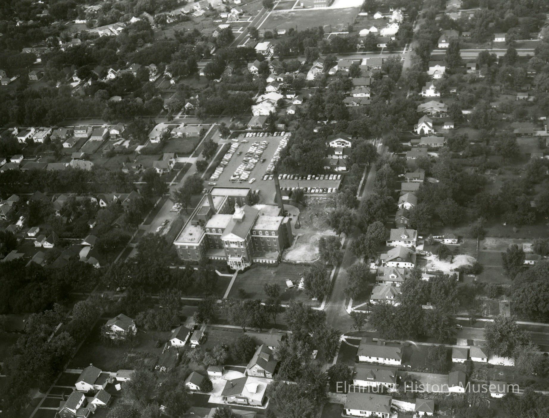 Aerial view of Elmhurst Memorial Hospital at Schiller Street and Avon Road and the surrounding neighborhood.